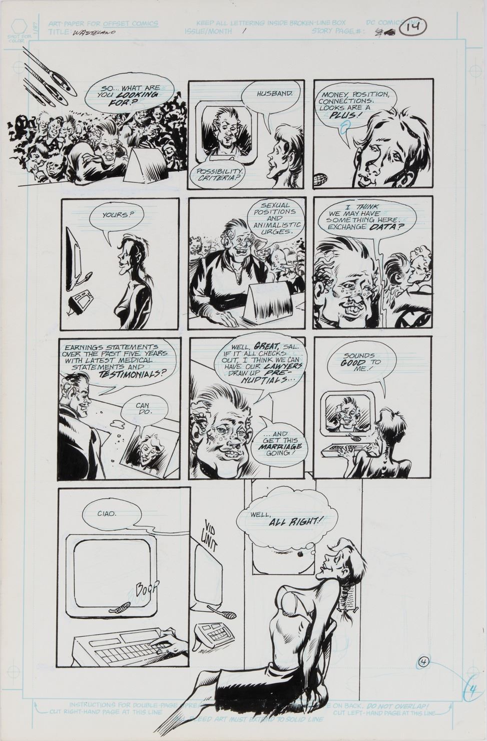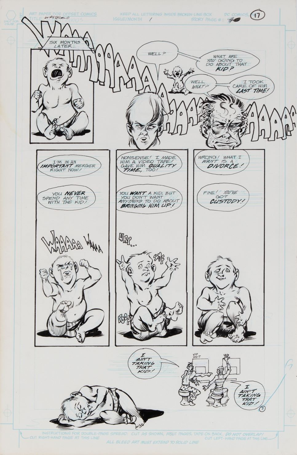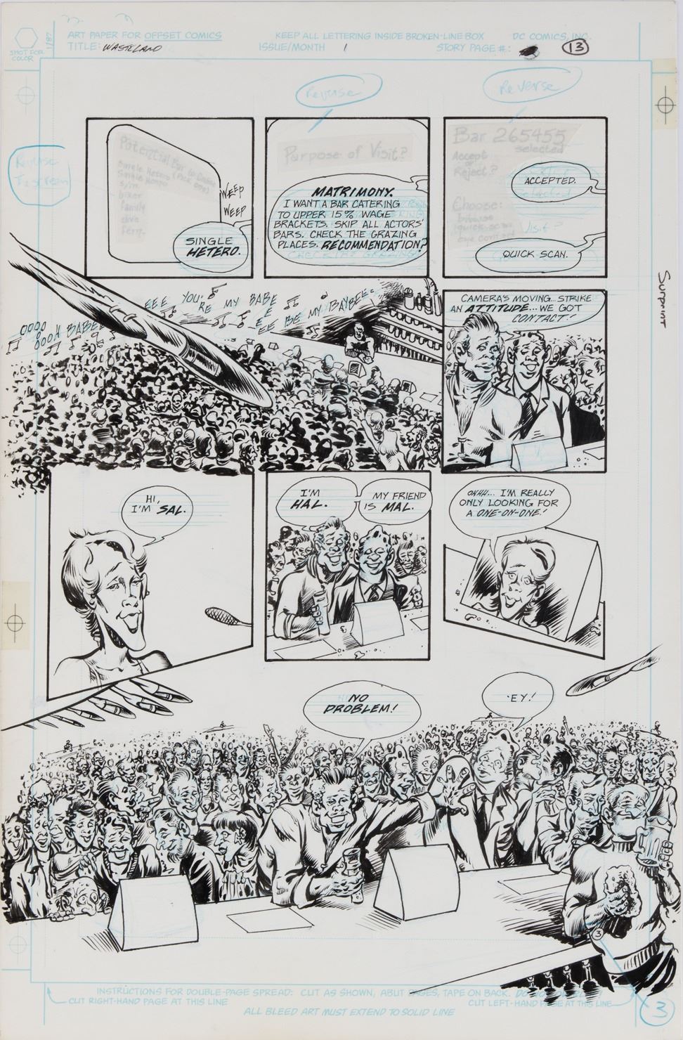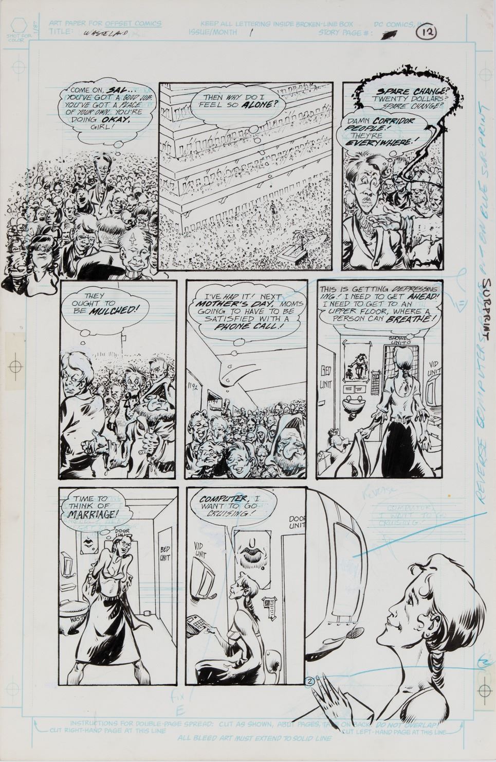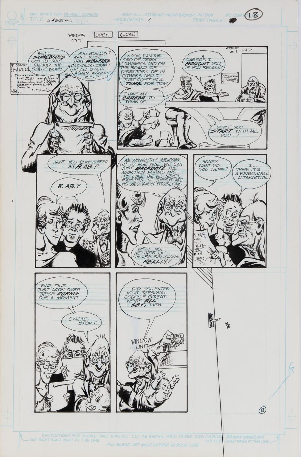 169. William Messner-Loeb original artwork for Wasteland #1 complete 9-page story "R.ab.". (DC, 1987) Accomplished in pen and ink on 13 x 19.5 in. From issue #1 of the critically acclaimed 1987 DC series Wasteland. "R.ab." features Messner-Loeb's dynamic story telling skills which are edgy, as befits a horror series, while also harkening back to traditional comics pacing. Rare to find a complete story available. In very good condition. $300 - $500
