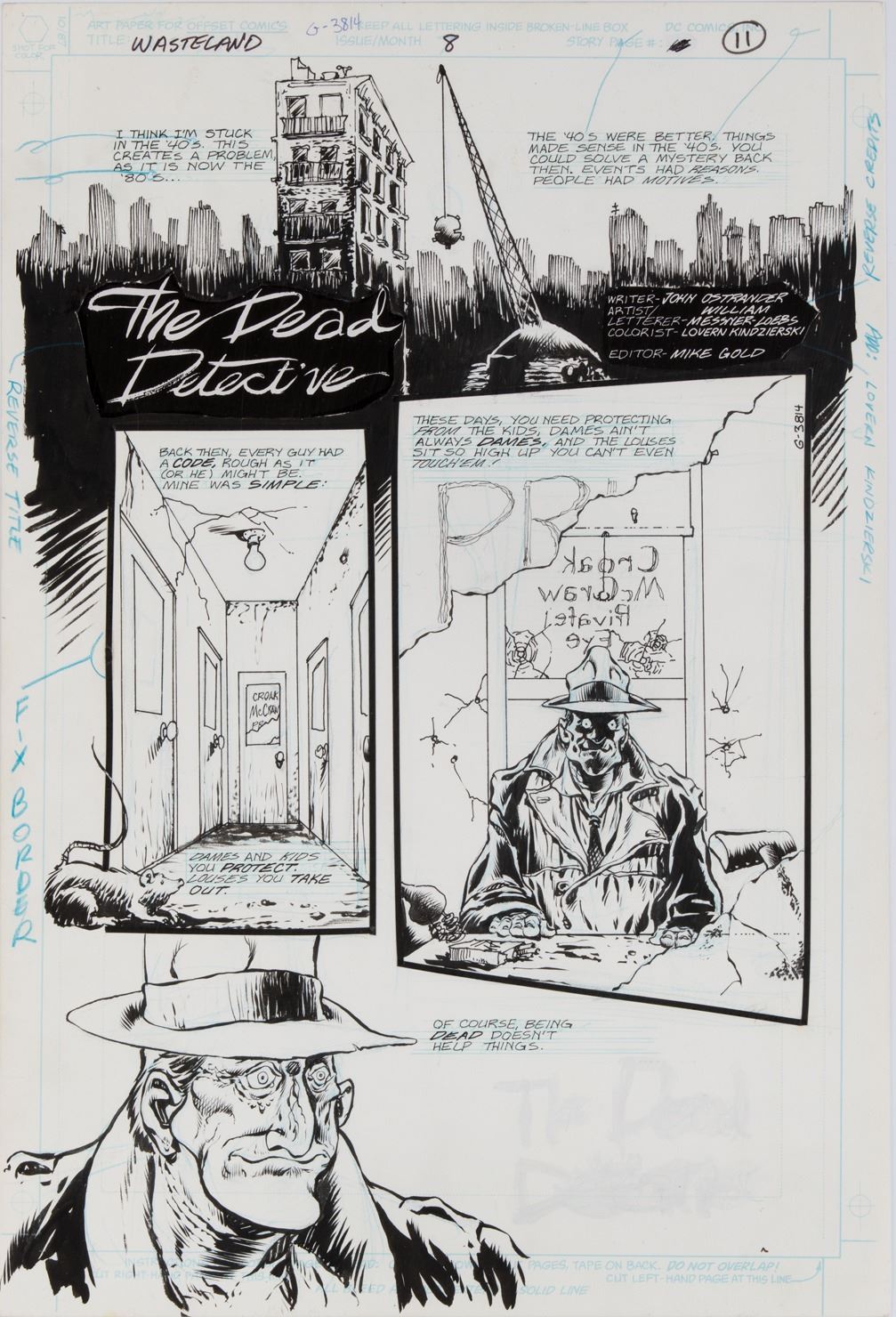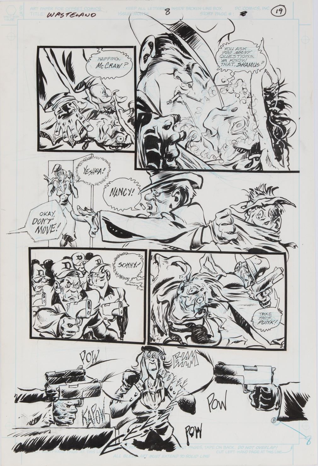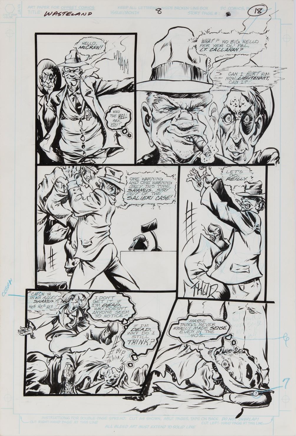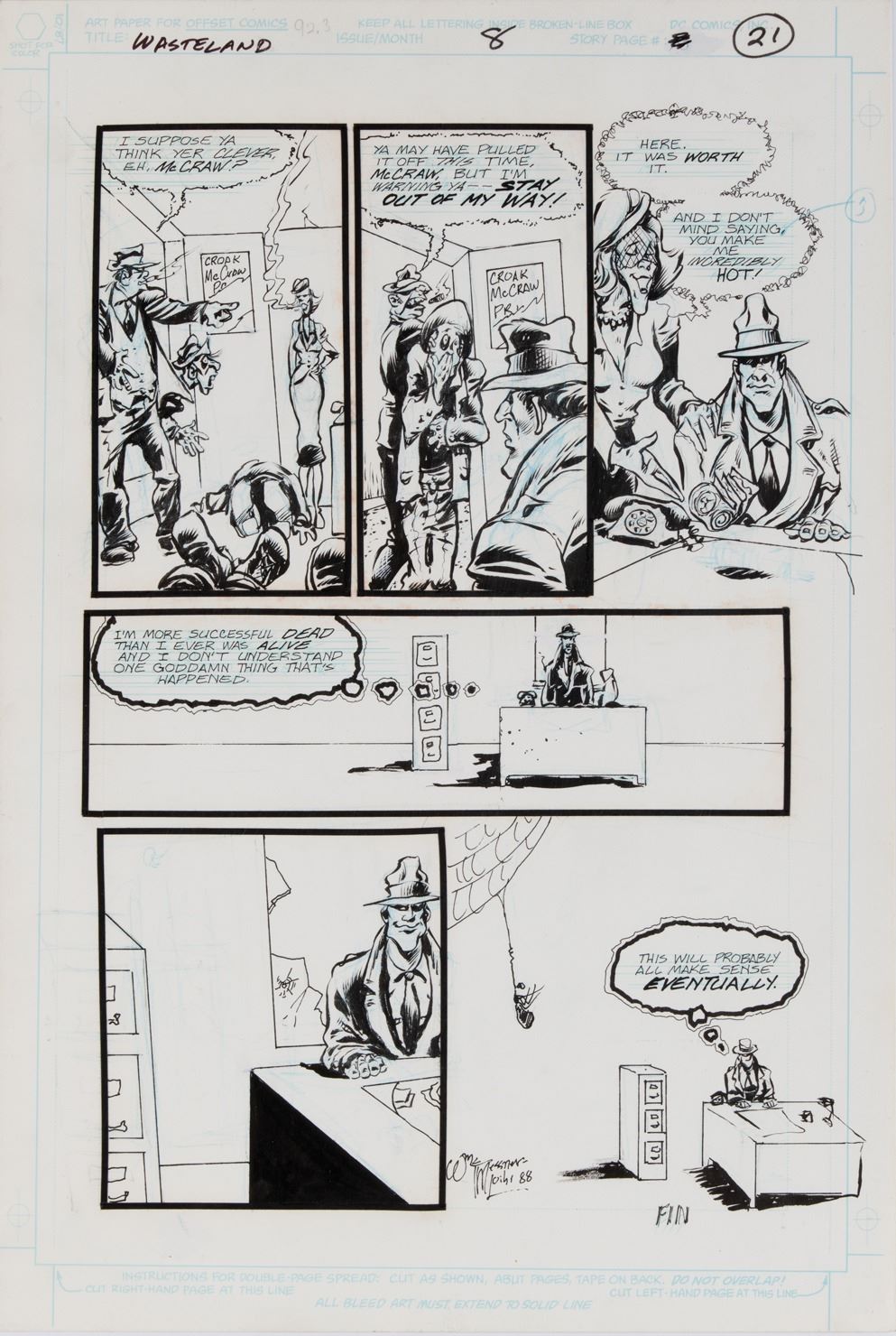 170. William Messner-Loeb original artwork for Wasteland #8 complete 9-page story "The Dead Detective". (DC, 1988) Accomplished in pen and ink on 13 x 19.5 in. Bristol art board. From issue #8 of the critically acclaimed series Wasteland. Signed on the last page. Fine rendering throughout, reminiscent of Will Eisner's story telling style, with a modern, edgier feel. In very good condition. $500 - $700