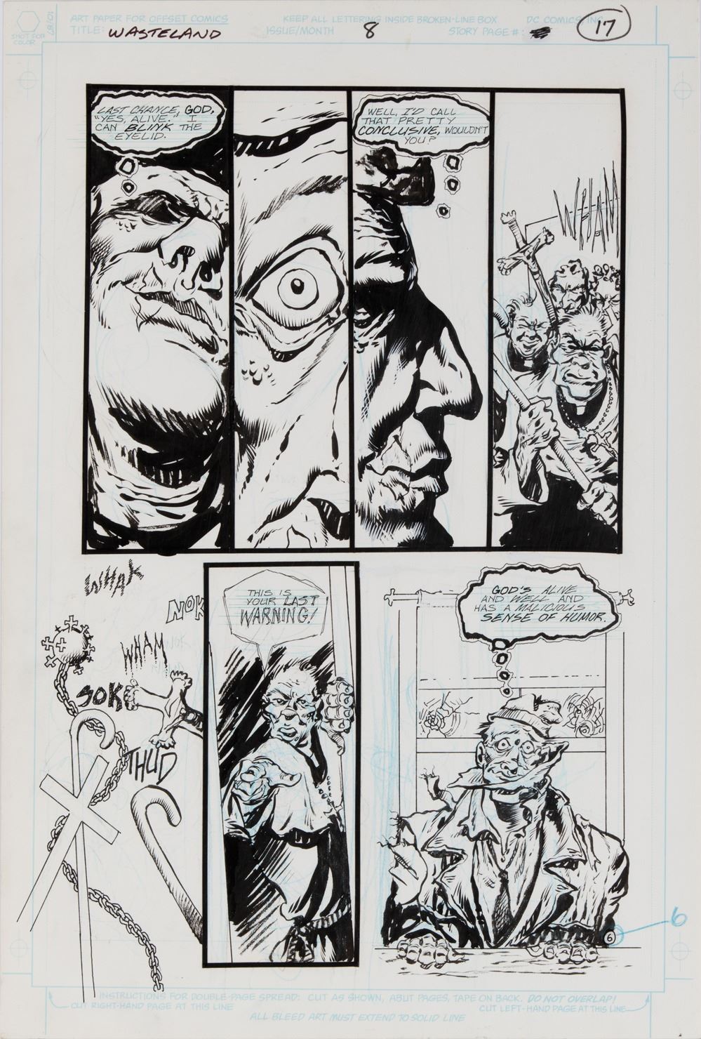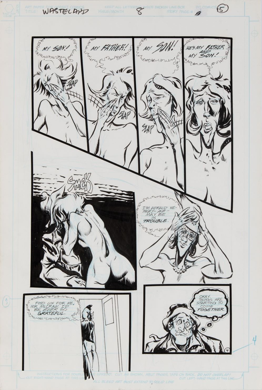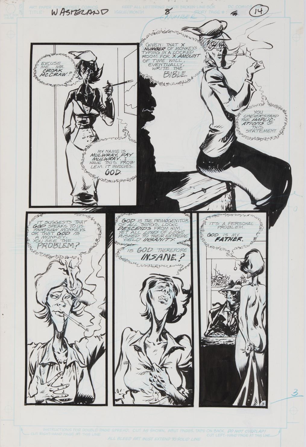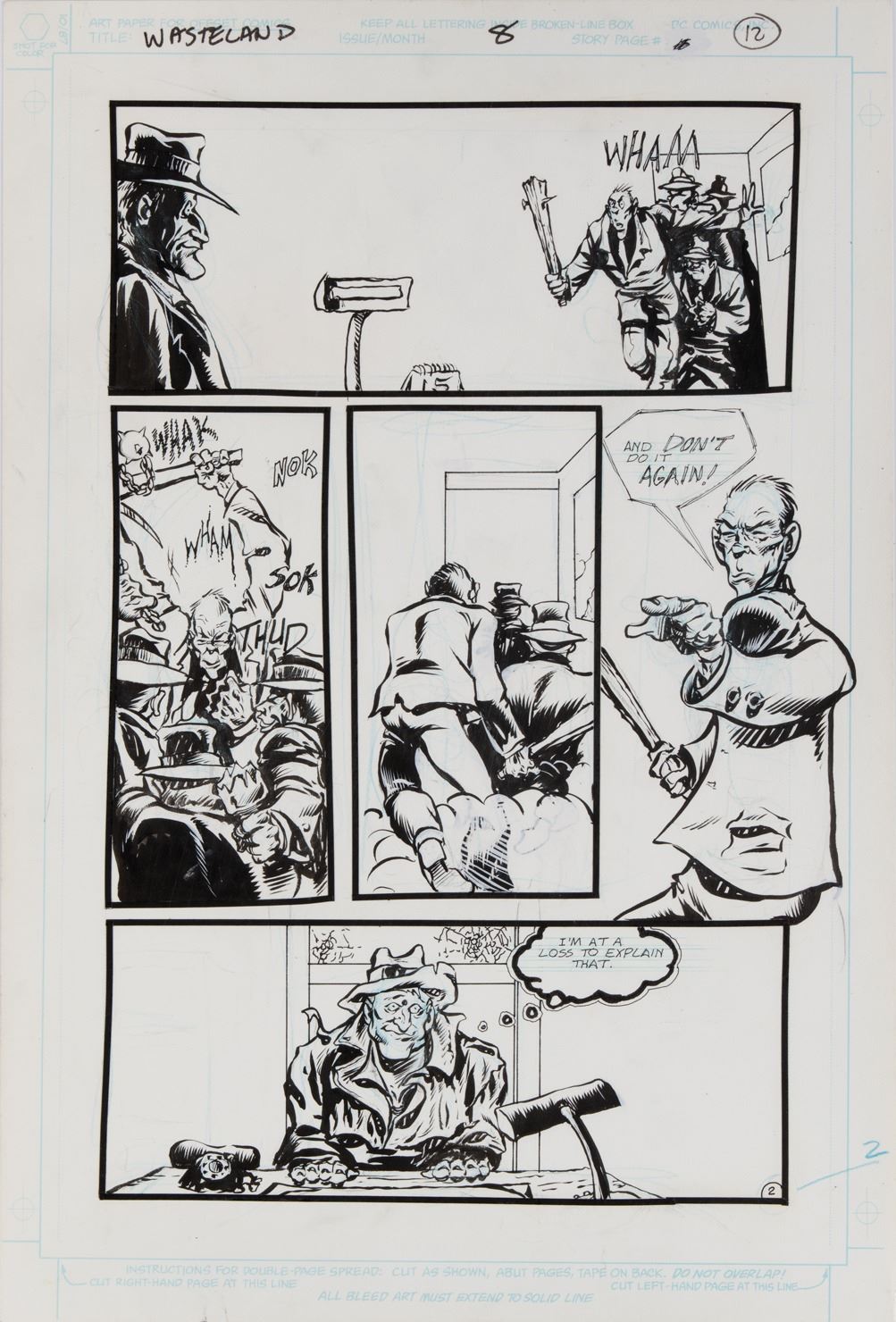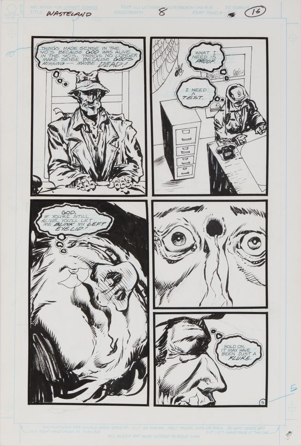 170. William Messner-Loeb original artwork for Wasteland #8 complete 9-page story "The Dead Detective". (DC, 1988) Accomplished in pen and ink on 13 x 19.5 in. Bristol art board. From issue #8 of the critically acclaimed series Wasteland. Signed on the last page. Fine rendering throughout, reminiscent of Will Eisner's story telling style, with a modern, edgier feel. In very good condition. $500 - $700