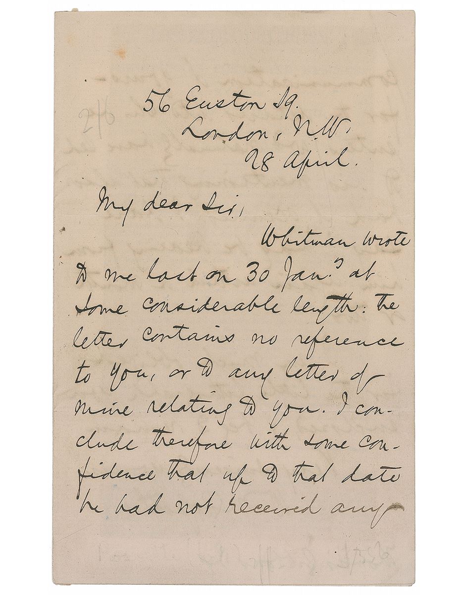 English writer and critic (1829–1919). ALS signed “W. M. Rossetti,” one page both sides, 4.5 x 7, personal letterhead, April 28. Letter to Thomas Gibbons, in part: “Whitman wrote to me last on 30 Jan. at some considerable length. The letter contains no reference to you, or to any letter of mine relating to you. I conclude therefore, with some confidence that up to that date he had not received any communication of yours for the details into which he enters would naturally have led to his mentioning that also had it occurred. I dare say I may be hearing from him again within a month or two.” A pair of articles is affixed to the front of the second integral page. Show-through from writing to opposing sides and two blocks of toning to signed page, otherwise fine condition. A well-known member of the celebrated Rossetti family—brother to both Dante Gabriel and Christina—William Michael Rossetti introduced Whitman’s poetry to Europe’s literary elite with his 1868 selection Poems by Walt Whitman. Though it contained only fragments of Leaves of Grass and was later called by Whitman ‘the horrible dismemberment’ of his book, this first British edition was well received and made a significant impact on his career.