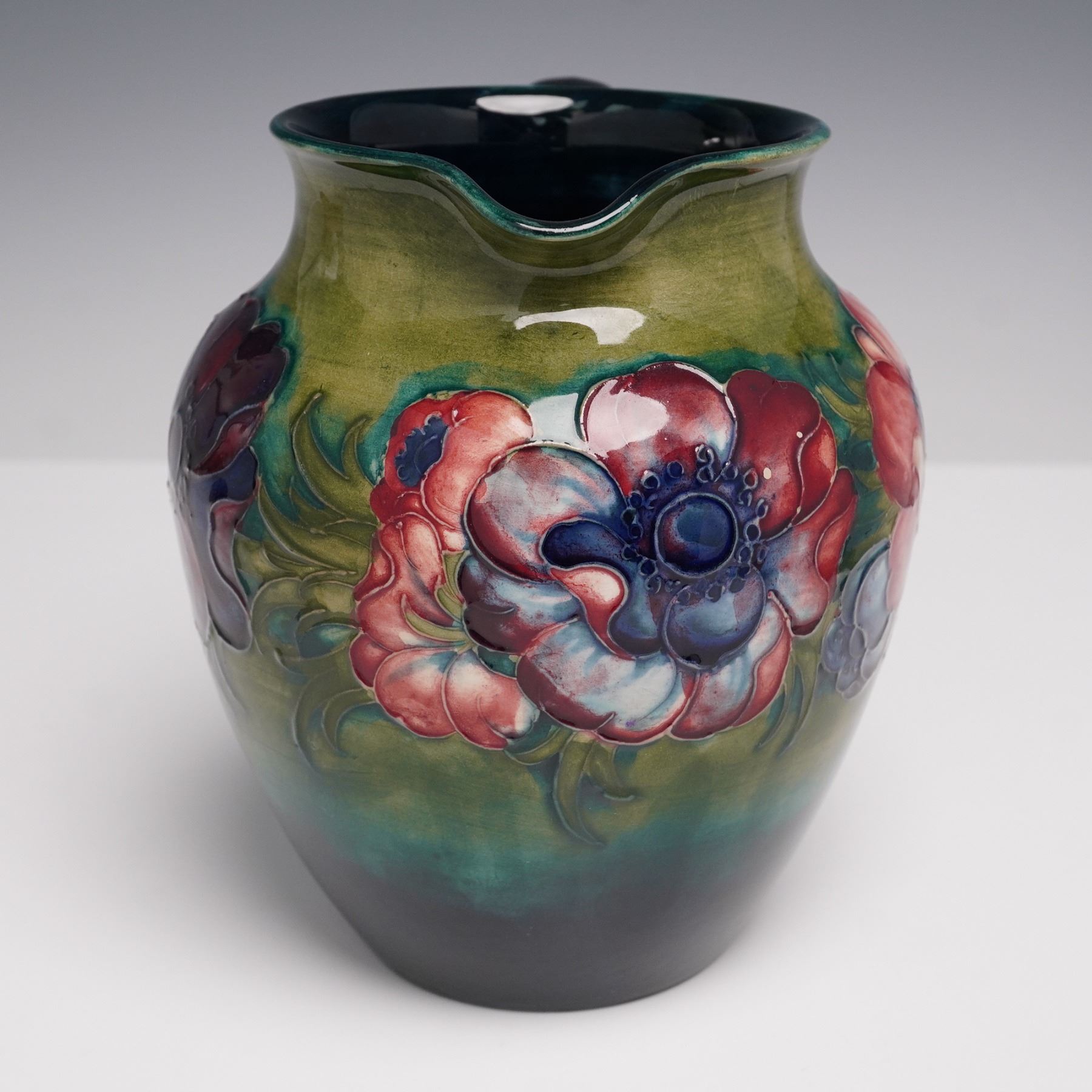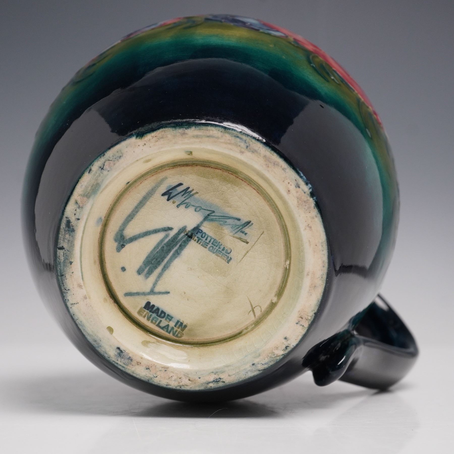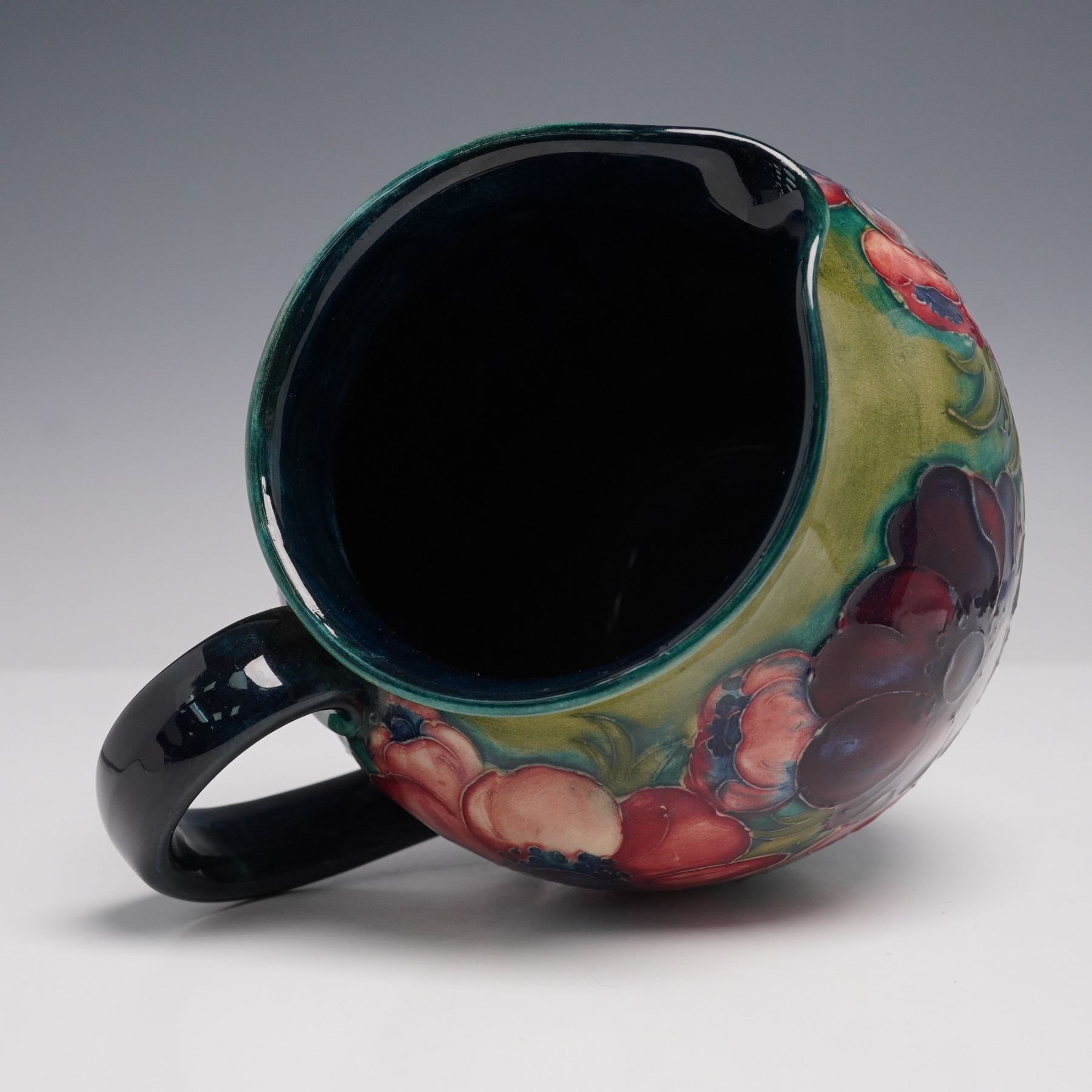 A precious milk jug decorated in the Anemone pattern. The rounded form enhanced with large tube lined scarlet and violet anemone blossoms accompanied by green foliage, all reserved against a shaded ground blending olive green into deep blue. The jug features a rounded handle and gently flared spout. Signed W Moorcroft and impressed to underside. "Potter to H. M. the Queen" impressed.