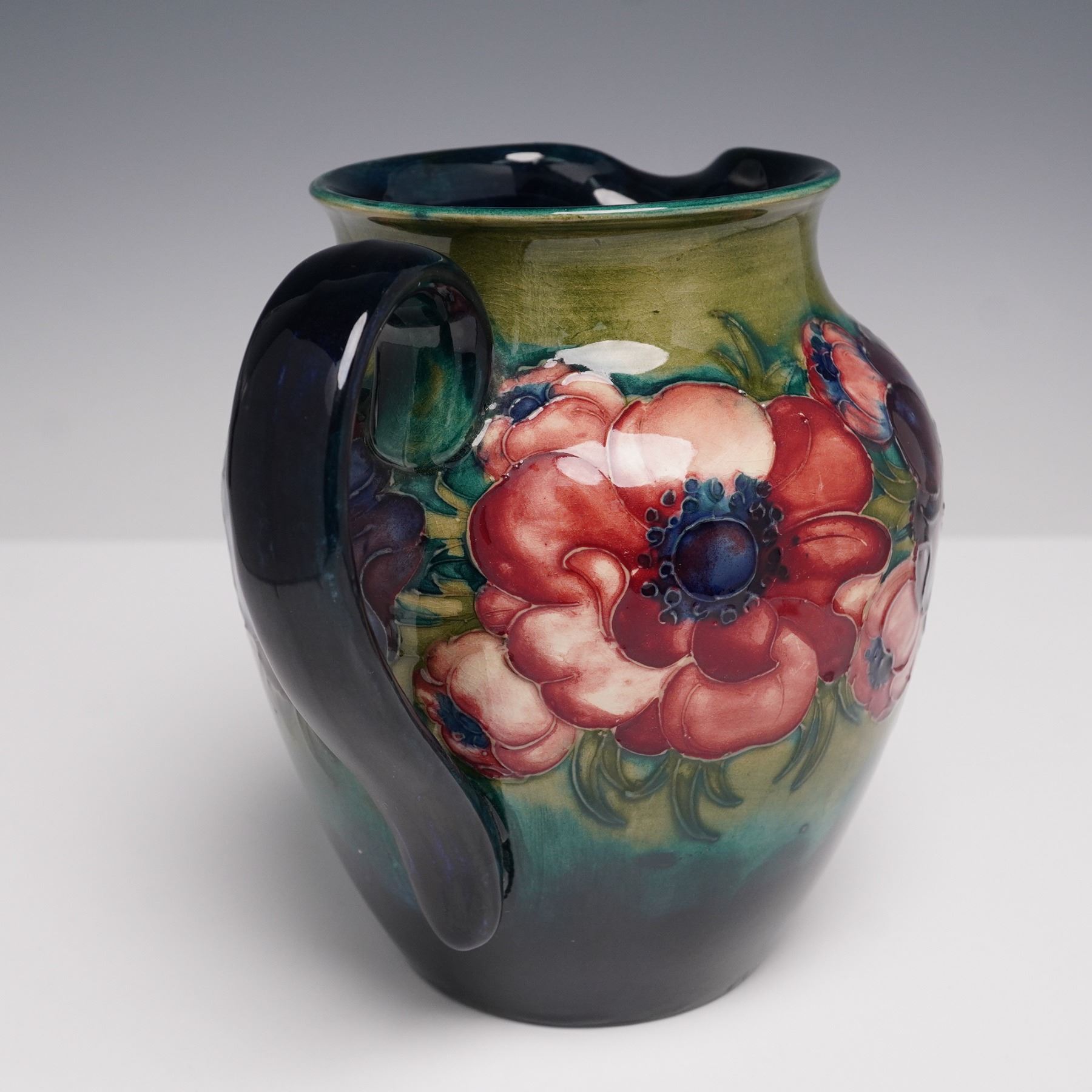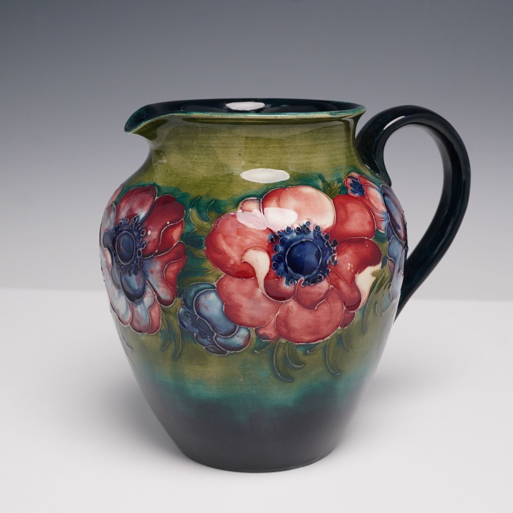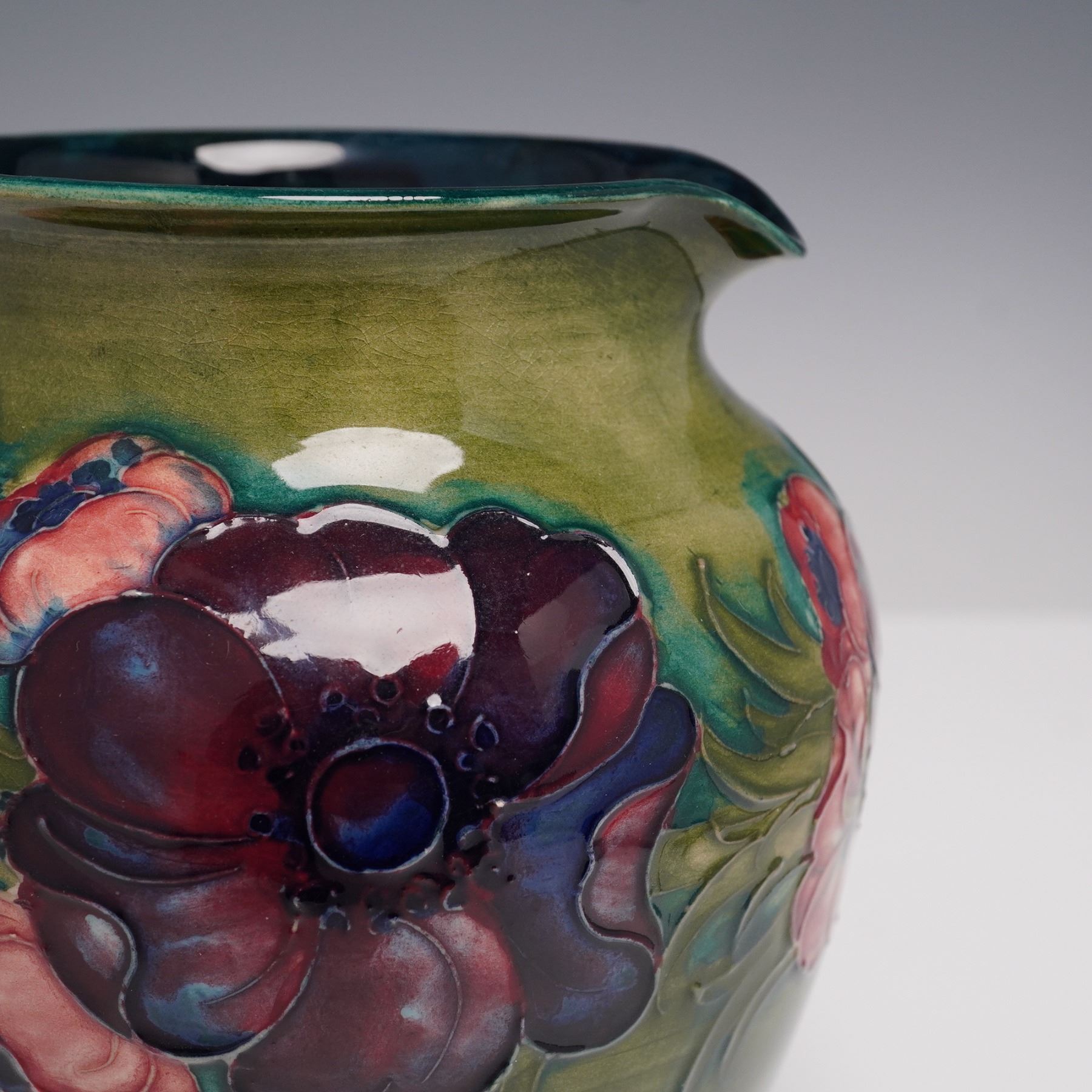 A precious milk jug decorated in the Anemone pattern. The rounded form enhanced with large tube lined scarlet and violet anemone blossoms accompanied by green foliage, all reserved against a shaded ground blending olive green into deep blue. The jug features a rounded handle and gently flared spout. Signed W Moorcroft and impressed to underside. "Potter to H. M. the Queen" impressed.