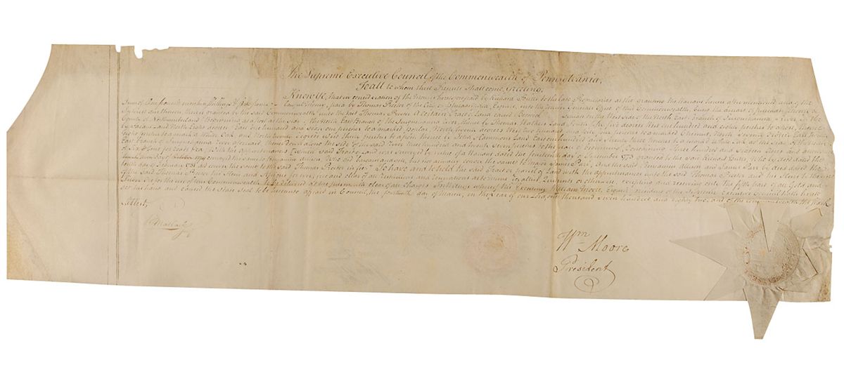 Moore (1735–1793) served as president of Pennsylvania from 1781–82. Matlack (1730–1829) was an American merchant, surveyor, architect, statesman, and patriot in the American Revolution. Manuscript vellum DS, signed “Wm. Moore, President,” one page, 29 x 8.5, March 14, 1782. Upon receipt of “one pound, nineteen shillings & five pence lawful money, paid by Thomas Proctor,” Moore grants him “a certain tract of land called Bernick,” situated Northumberland County, Pennsylvania. Signed at the conclusion by Moore and countersigned by Timothy Matlack, “T. Matlack, Sec’y.” Complete eight-point paper Pennsylvania state seal is affixed to the lower right, with a few folds to points and moderate soiling. In very good condition, with intersecting folds, moderate scattered soiling, clipped upper corners, and a few chips and tears to the edges.