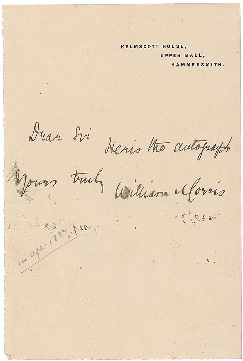English artist, writer, textile designer, and socialist associated with the Pre-Raphaelite Brotherhood and English Arts and Crafts Movement (1834–1896). ANS, one page, 4.75 x 7, Kelmscott House letterhead, no date but bears a pencil notation of April 14, 1888. Response to an admirer. In full: “Here is the autograph.” A few brushes to ink, otherwise fine condition.