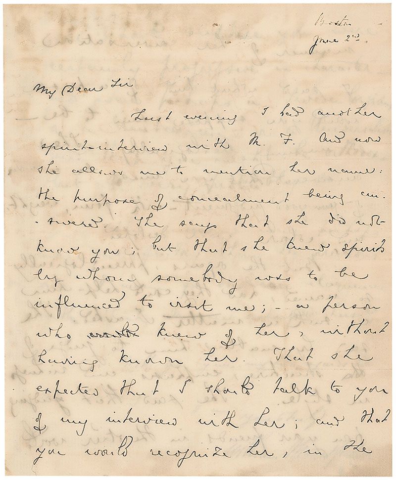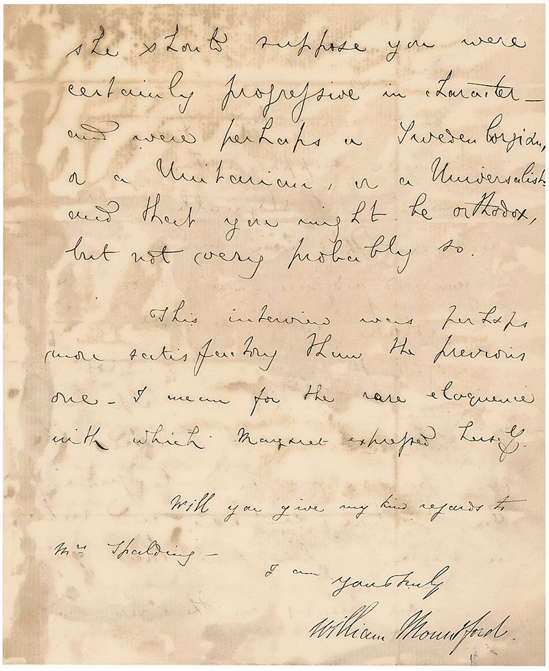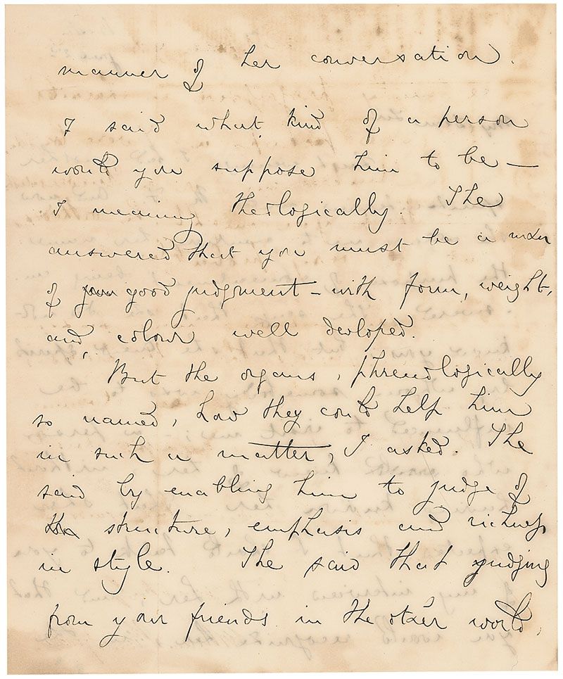 Unitarian preacher and author (1816–1885) who spent the end of the 1850s in Rome, where he grew increasingly interested in and attracted to spiritualism and the supernatural. LS, three pages on two adjoining sheets, 7.5 x 9, June 2. Unusual letter to a gentleman regarding encounters with the supernatural. In full: "Last evening I had another spirit-interview with M. F. and now she allows me to mention her name: the purpose of concealment being answered. She says that she did not know you; but that she knew spirits by whom somebody was to be influenced to visit me; a person who knew of her, without having known her. That she expected that I should talk to you of my interview with her; and that you would recognize her, in the manner of her conversation. I said what kind of a person would you suppose him to be—I meaning theologically. She answered that you must be a man of good lodgment—with form, weight, colour well developed. But the organs, phrenologically so named, how they could help him in such a matter, I asked. She said by enabling him to judge of structure, emphasis and richness in style. She said that judging from your friends in the other world, she should suppose you were certainly progressive in character—and were perhaps a Swedenborgian, or a Unitarian, or a Universalist, and that you might be orthodox, but not very probably so. This interview was perhaps more satisfactory than the previous one—I mean for the rare eloquence with which Margaret expressed herself." In very good condition, with intersecting folds, scattered staining and soiling, show-through from writing on reverse of first page, and mounting remnants to reverse of second integral page.