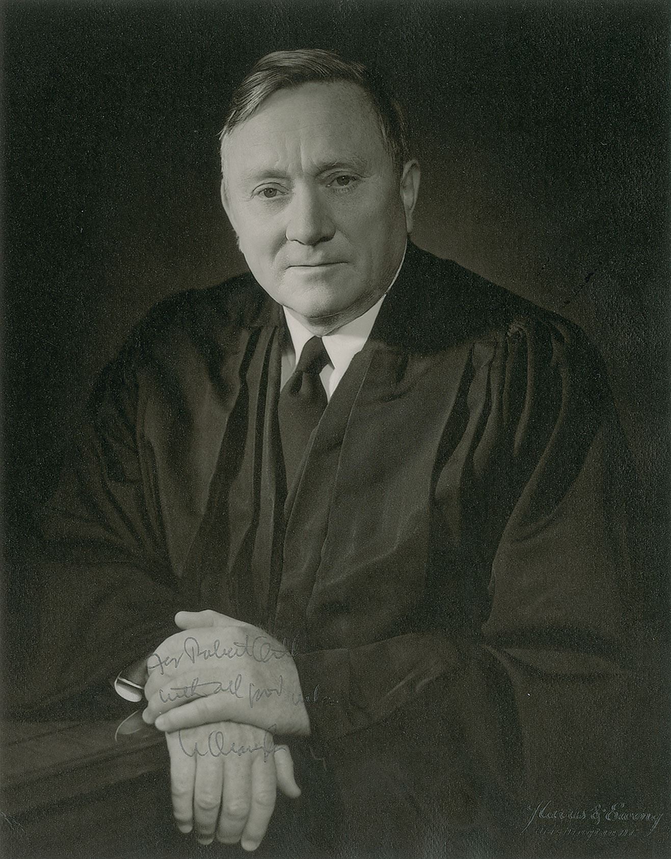 Vintage matte-finish 7.75 x 10 photo of Associate Justice Douglas in his judicial robe by Harris & Ewing, signed and inscribed in black ballpoint, "For Robert Orth, with all good wishes, W. Douglas.” Blindstamped in the lower right corner by the studio, and stamp-dated May 3, 1972 on the reverse. In fine condition, with light edge rippling.
