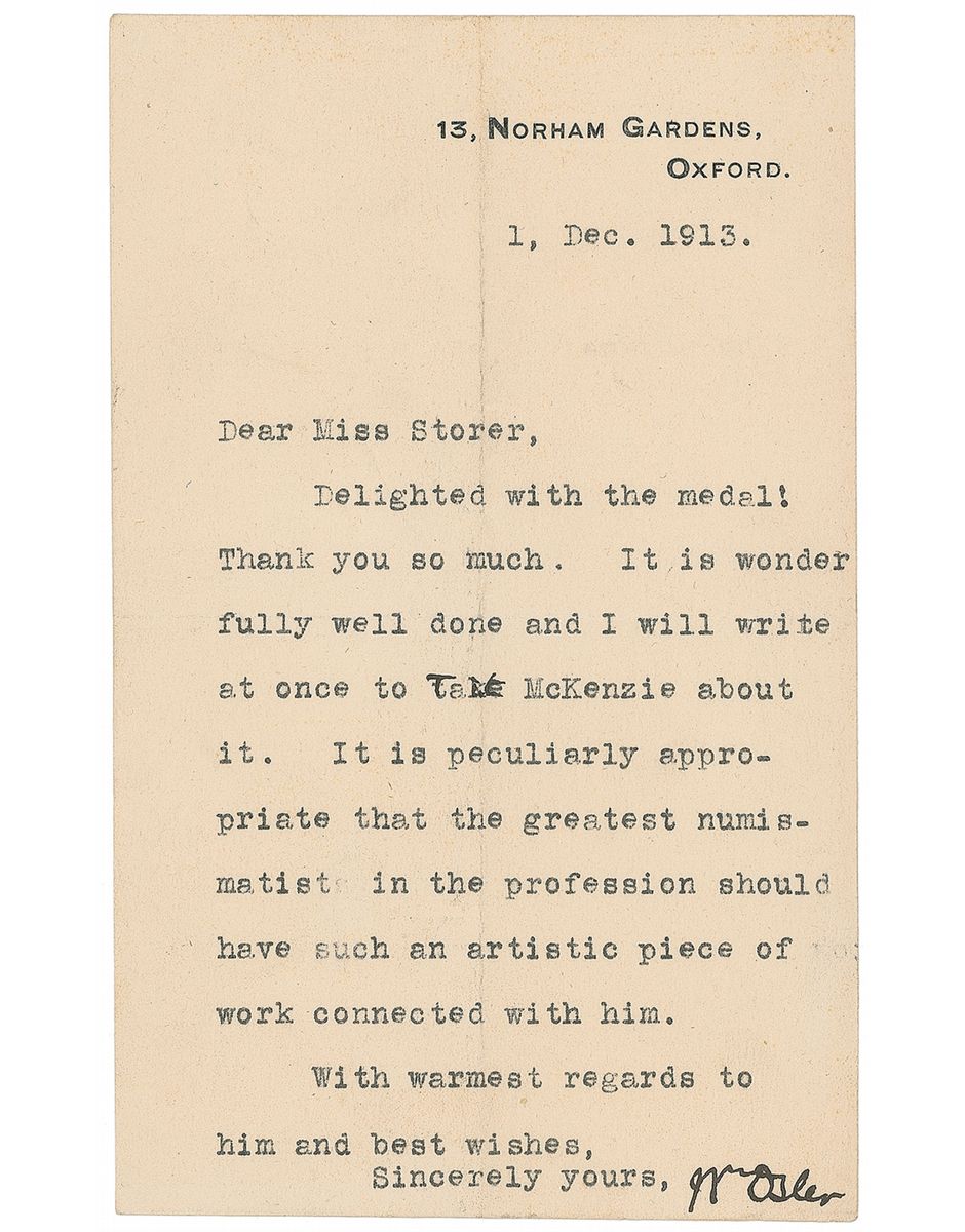 Canadian-born physician and researcher (1849–1919) who was a founding professor of Johns Hopkins Hospital. TLS signed “Wm. Osler,” one page, 3.75 x 6.25, personal letterhead, December 1, 1913. Letter to Miss Storer. In part: “Delighted with the medal! Thank you so much. It is wonderfully well done and I will write at once to talk [to] McKenzie about it. It is peculiarly appropriate that the greatest numismatist in the profession should have such an artistic piece of work connected with him.” In fine condition, with central vertical and horizontal folds. This letter refers to a bronze medal designed by R. Tait McKenzie, a sculptor and physician, made to honor fellow physician and numismatist Horatio Storer. Intriguing content associating a number of prominent medical practitioners of their day.