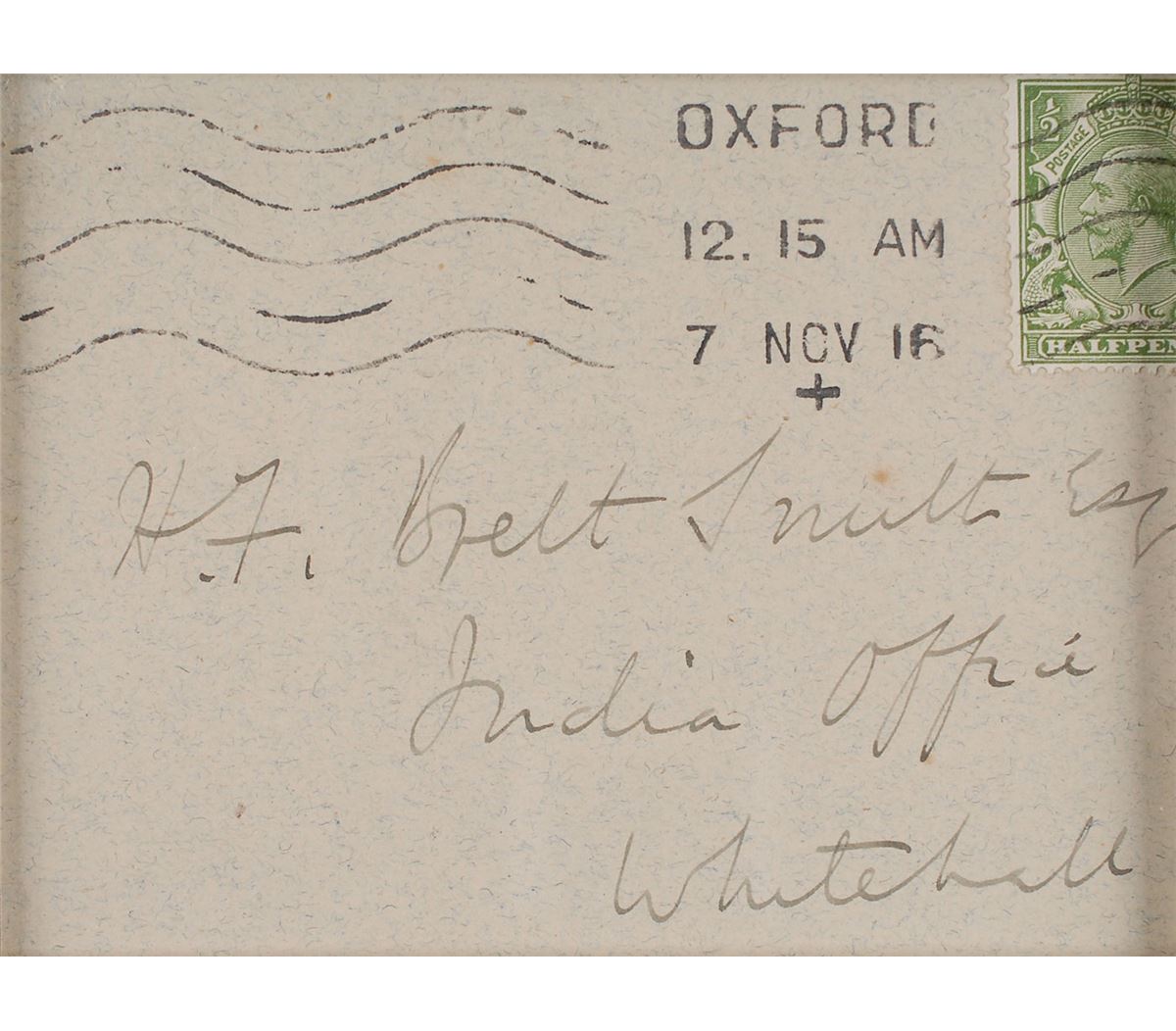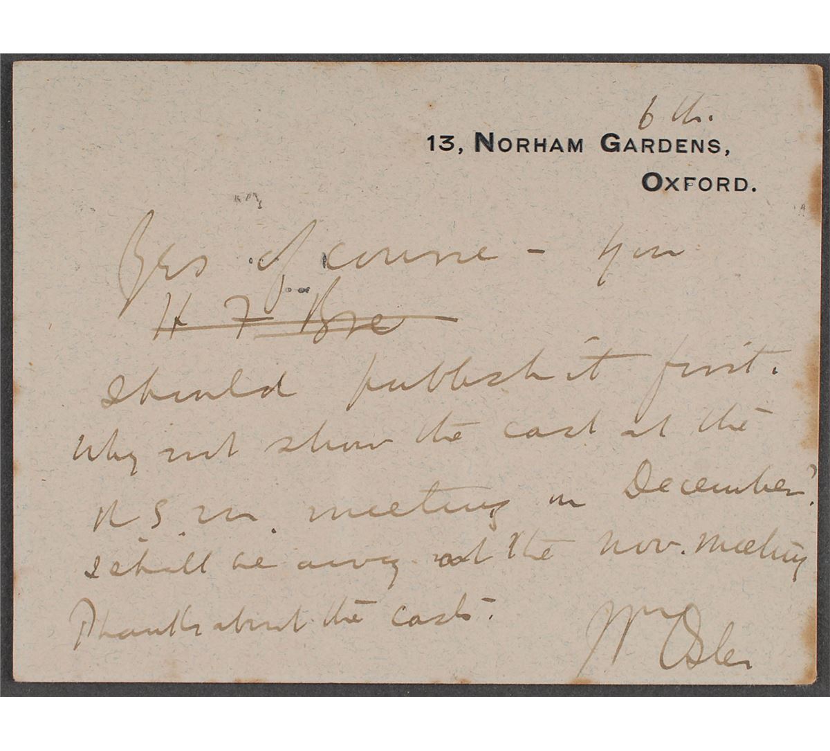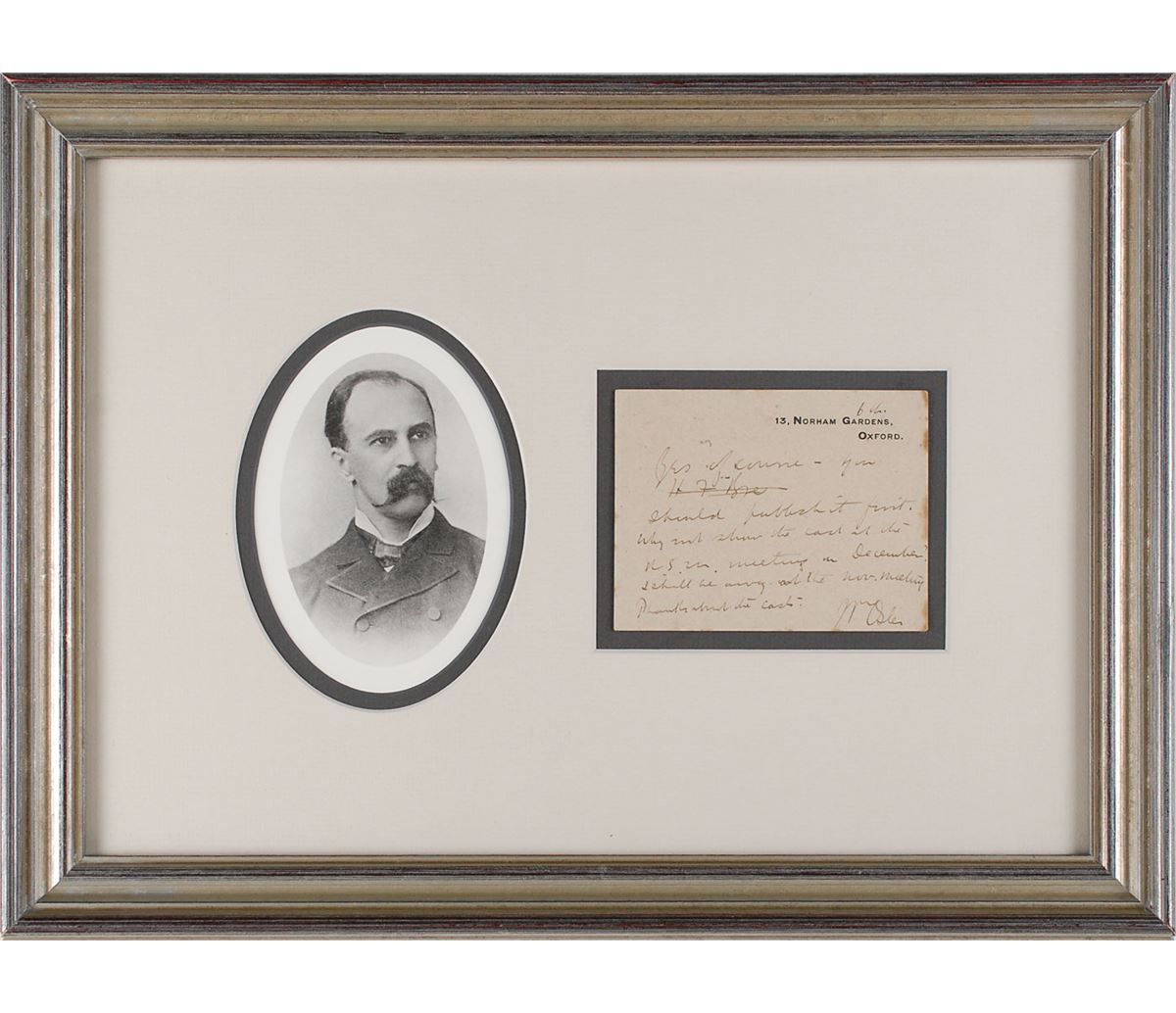 Canadian-born physician and researcher (1849–1919) who was a founding professor of Johns Hopkins Hospital. ALS signed “Wm Osler,” one page on a 4.5 x 3.5 personal stationery postcard, November 6, 1916. Letter to Brett Smith at the India Office in London. In part: “Yes of course—you should publish it first. Why not show the cast at the R. S. M. [Royal Society of Medicine] meeting in December. I shall be away at the Nov. meeting.” Addressed on the reverse in Osler’s hand. Archivally double-matted and framed with a portrait of Osler to an overall size of 17 x 12.5, with a window in the backing for viewing the reverse. In fine condition, with soiling to edges.