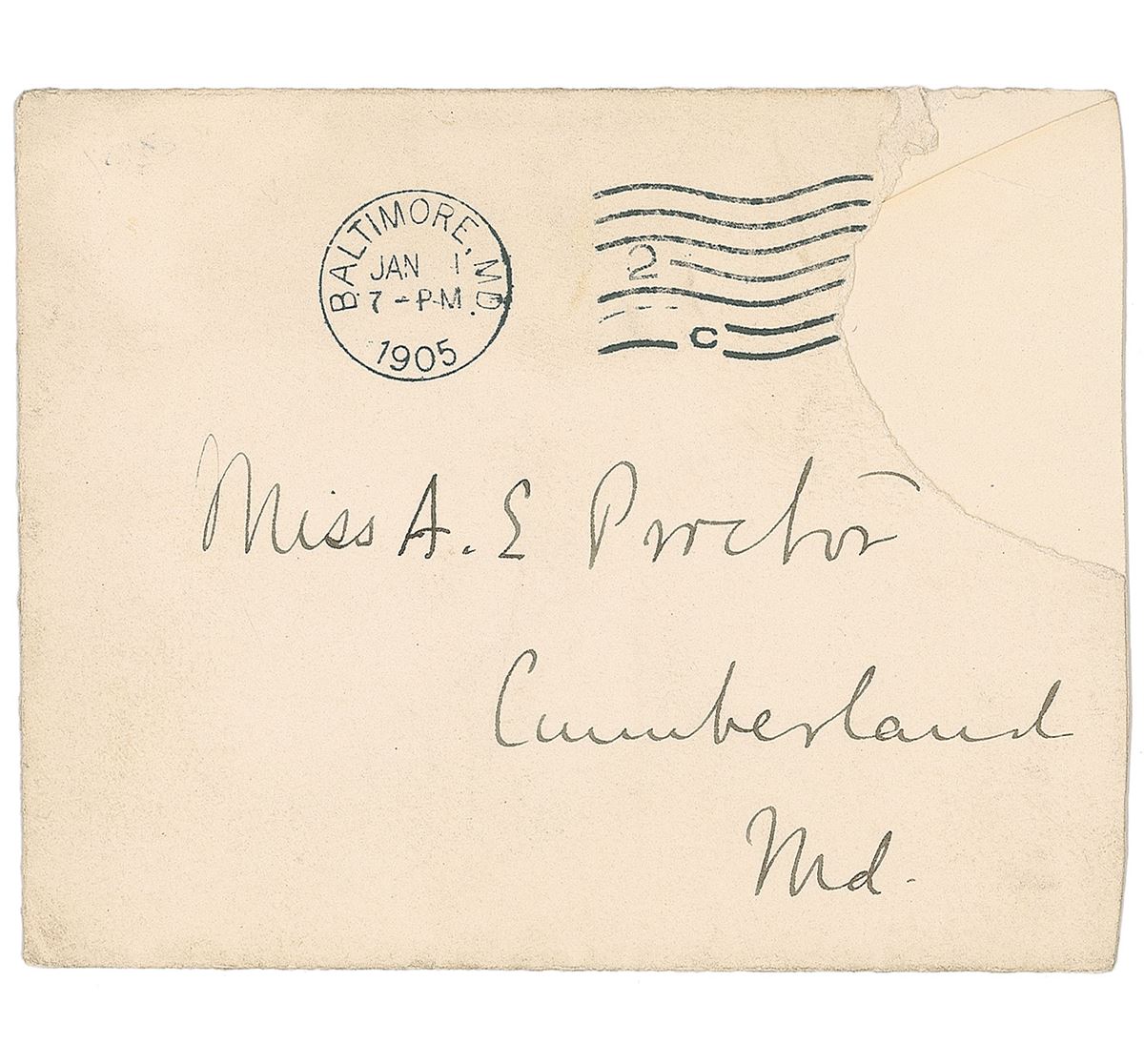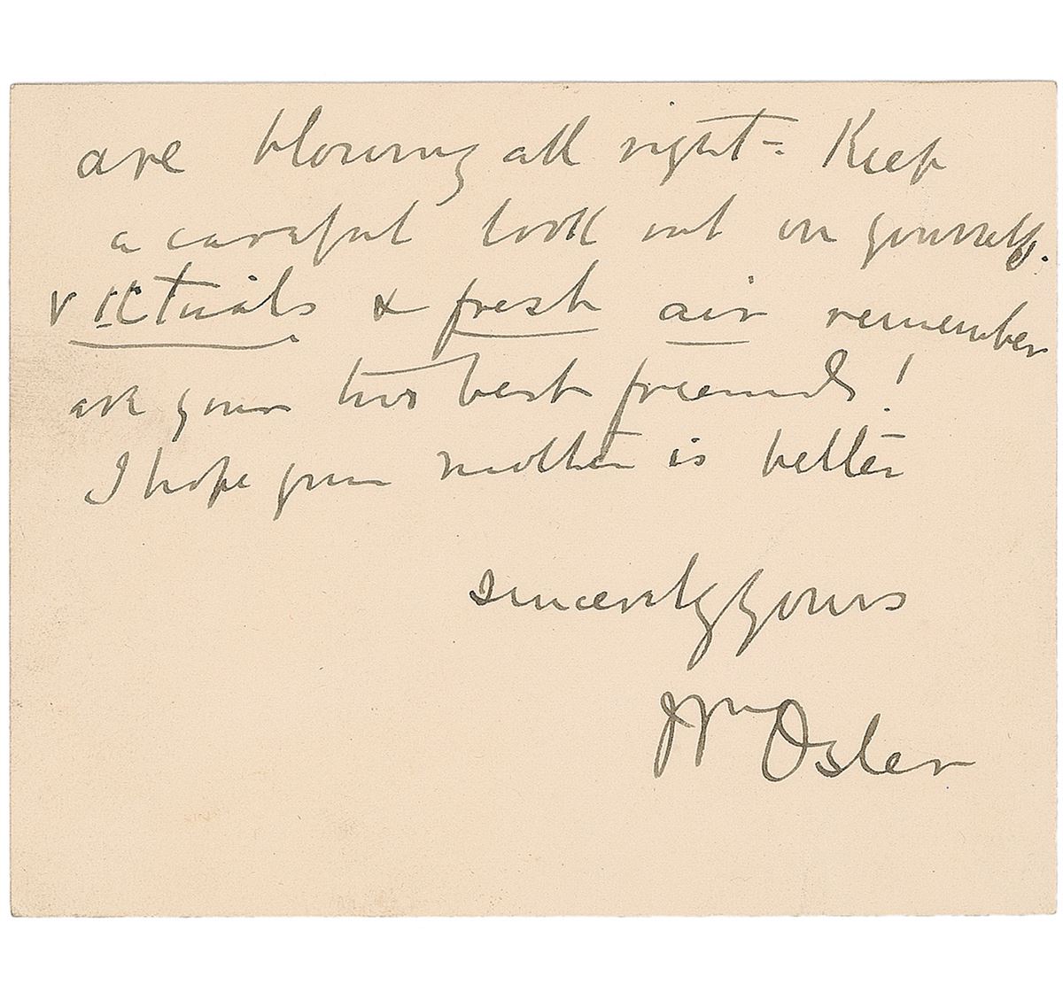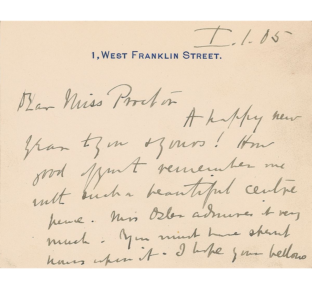 Canadian-born physician and researcher (1849–1919) who was a founding professor of Johns Hopkins Hospital. ALS signed “Wm. Osler,” one page both sides, 4.5 x 3.5, personal stationery card, January 1, 1905. Letter to Miss A. E. Proctor, in full: “A happy new year to you & yours! How good of you to remember me with such a beautiful centerpiece. Mrs. Osler admires it very much. You must have spent hours upon it. I hope your bellows are blowing all right. Keep a careful look out on yourself. Victuals & fresh air remember are your two best friends! I hope your mother is better.” In fine condition, with a light crease to lower edge. Accompanied by the original mailing envelope, addressed in his own hand.