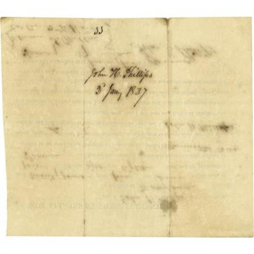 <B>William P. Miller Partly Printed Document Signed</B></I> "<I>William P. Miller/Col. Com. 2nd R R T.I.</B></I>," one page, 7" x 6.25". Washington, January 2, 1837. In full "<I>Know All Men by these presents that I, John H. Phillips born in the state of Maryland aged twenty four years, five feet seven inches high, of fair complexion, light eyes light hair, and by profession a farmer do hereby acknowledge to have this day voluntarily enlisted as a soldier in the army of the Republic of Texas, for the period during the War unless sooner discharged by proper authority; do also agree to accept such bounty, pay, rations, and clothing, as is or may be established by law; and I, John H. Philips do solemnly swear that I will bear true faith and allegiance to the Republic of Texas, and that I will bear true faith and allegiance to the Republic of Texas, and that I will serve her honestly and faithfully against all her enemies and opposers whomsoever, and that I will observe and obey the orders of the President of the Republic of Taxas [sic], and the orders of the officers appointed over me according to the rules and articles of War.</B></I>" Also signed "<I>John H. Phillips</B></I>." Ten months earlier, when Maj. William P. Miller and his Nashville Company of volunteers had anchored at the Texas port of Copano in late March 1836, they were captured by the Mexicans. Though also imprisoned at Goliad, Miller and his men were separated from Fannin's men and spared the massacre at Goliad. The men were taken to Matamoros as prisoners until freed by the terms of the Treaties of Velasco. A few months after his release, Col. Miller of the 2nd Regiment Texas Infantry has witnessed the enlistment of 24-year-old John H. Phillips of Maryland in the Texas Army to fight "during the War." Light soiling with show-through from docket on verso. Fine condition.<BR><BR><b>Shipping:</b> Flat Material, Small (<a target="_blank" href="http://www.heritageauctions.com/common/shipping.php">view shipping information</a>)