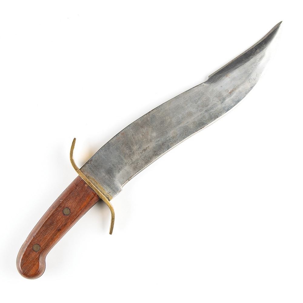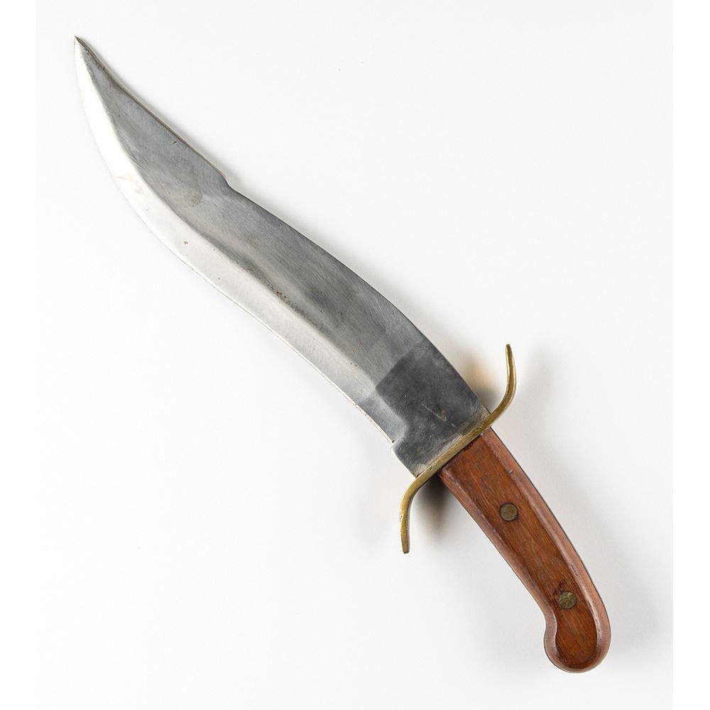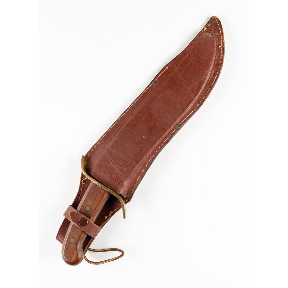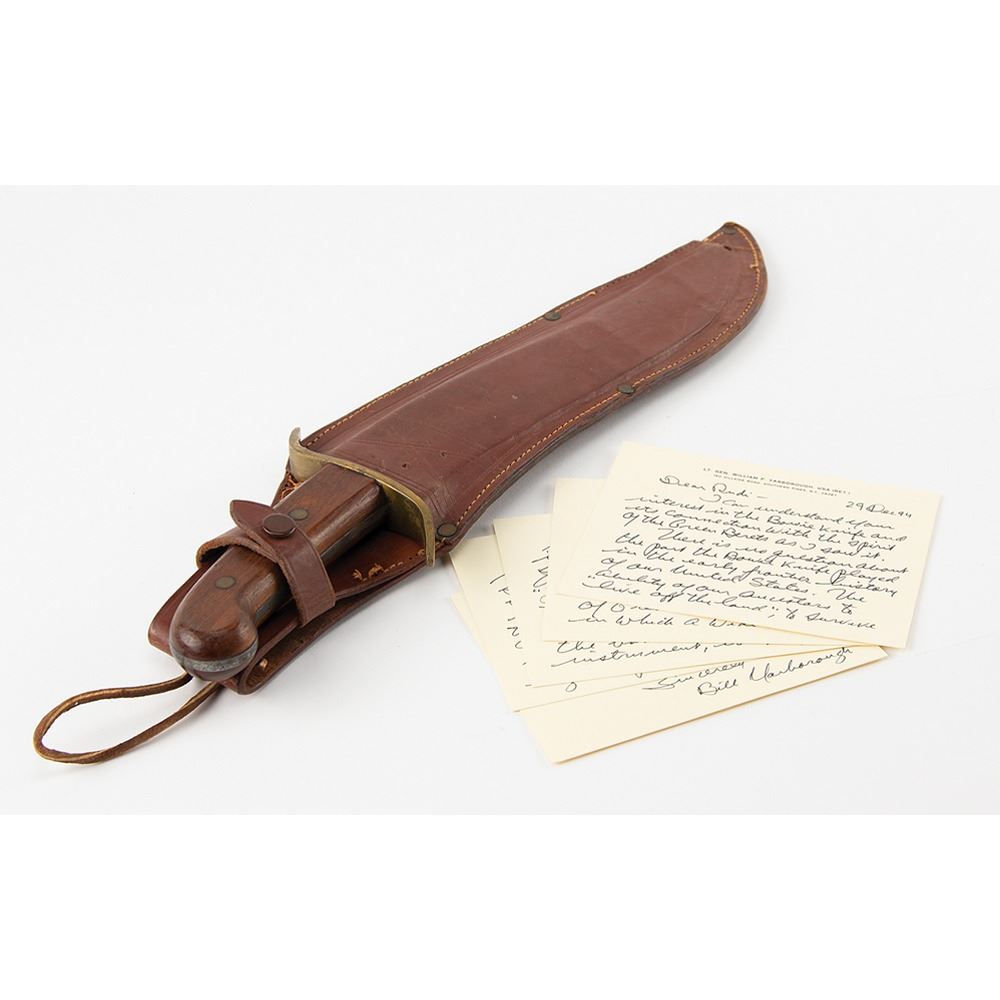 Given the special orientation of Green Berets toward environments in which a wide variety of missions would often include circumstances similar to those faced by American pioneers in ‘Indian Country,’ the appropriateness of the Bowie Knife was quite apparent. Above and beyond the basic utility of the instrument, its very special unique American character made the Bowie Knife a symbol—like the Crusaders' sword, of some of the intangibles that combine to produce that invaluable component of military morale—tradition. I tried to obtain authorization for making the Bowie an item of issue for Special Forces but the Quartermaster General did not share my enthusiasm and it never came to pass—(sorry about that!) That’s the story.†Included with the letter is a circa 1930 blacksmith-forged Bowie knife measuring an imposing 16Ë in length, which is accompanied by its leather sheath. In fine condition.