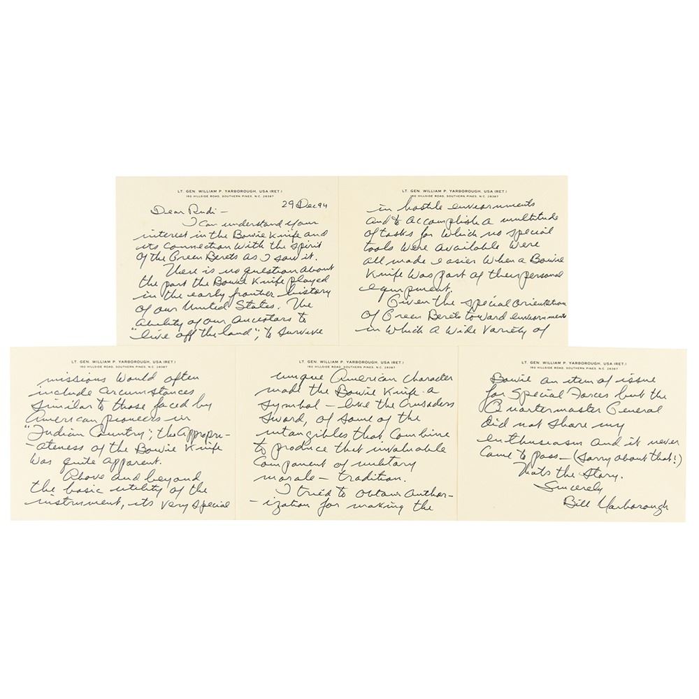 ALS signed “Bill Yarborough,†five pages, 5.5 x 4.25, personal letterhead, December 29, 1994. Handwritten letter detailing the history of the Bowie knife with the Green Berets, in full: “I can understand your interest in the Bowie Knife and its connection with the spirit of the Green Berets as I saw it. There is no question about the part the Bowie Knife played in the early frontier history of our United States. The ability of our ancestors to ‘live off the land,’ to survive in hostile environments and to accomplish a multitude of tasks for which no special tools were available were all made easier when a Bowie Knife was part of their personal equipment.