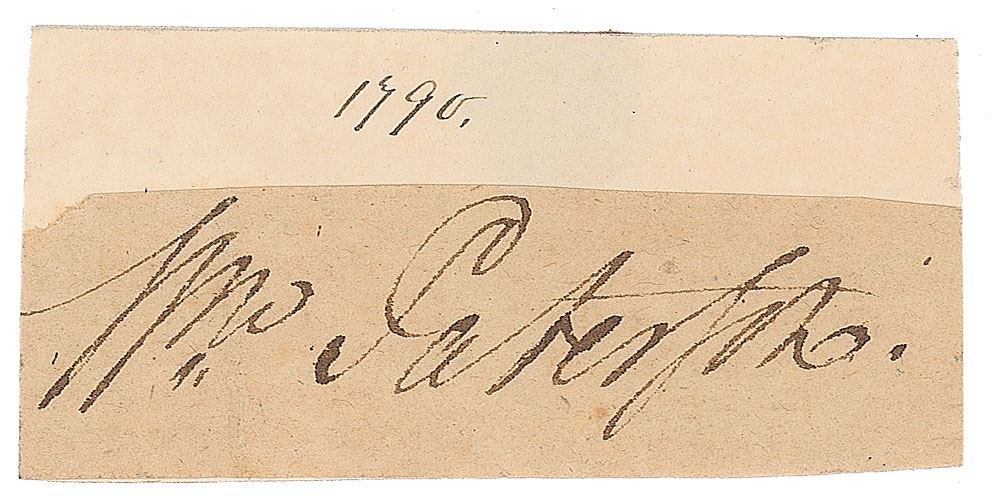 Rare ink signature, "Wm. Paterson,” on an off-white 2.5 x .75 slip affixed to a slightly larger card. In fine condition.