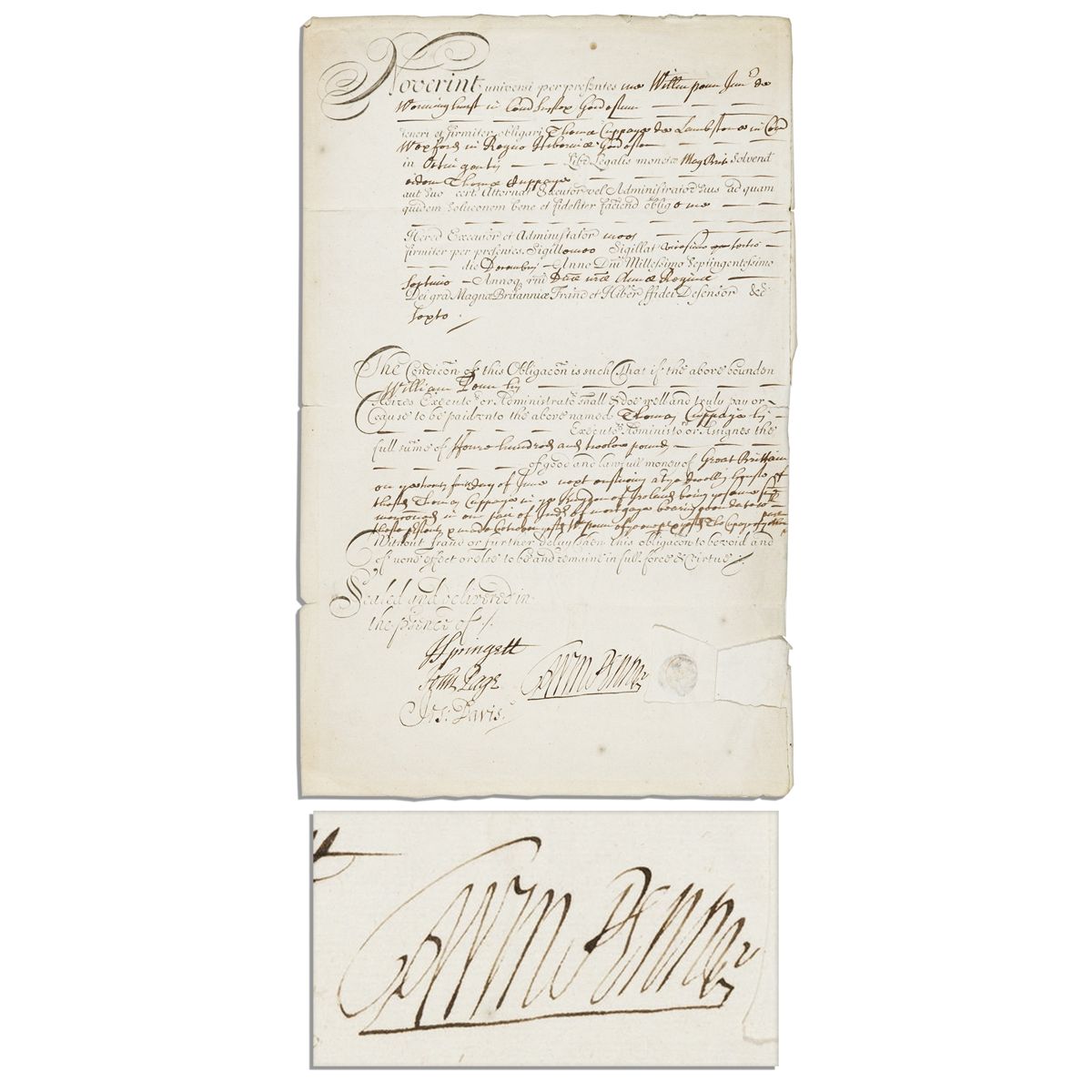William Penn document signed circa June 1707 from England. As the founder of the province of Pennsylvania, Penn lived in America and England during various periods of his life, and signs this document after returning to England amid an escalating financial predicament. Document in English and Latin is a financial settlement between Penn and a Thomas Cuppage, signed ''Wm Penn.'' as the executor of an estate. Reads in part: ''ffoure hundred...pounds of good and lawfull money of Great Britain.'' Countersigned by witnesses J. Springett, John Page, and Joseph Davis with docketing in an unknown hand to verso of blank leaf. Document on one page with integral blank leaf measures 8.25'' x 13''. Some separation along folds and chips to edges. Toning and foxing throughout. Very good condition overall.