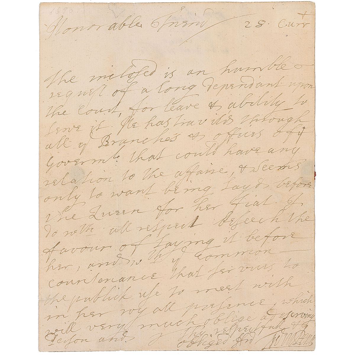 English-born Quaker (1644–1718) and founder of the colony that became the State of Pennsylvania. Extremely rare ALS signed “Wm Penn,” one page, 6 x 7.75, no date but circa 1708–1710. Letter to Henry Boyle, principal secretary of state at Windsor. In part: “The enclosed is an honorble request of a long dependant upon the Court, for leave & ability to serve it. He has travild through all of ye Branche’s & offices of ye Govermte that could have any relation to the affaire, & seems only to want being Layd before the Queen for her fiat. I do with all respect beseech the favour of Laying it before her.” Addressed on the reverse of the second integral page in Penn’s hand. A few small tape-repaired tears, otherwise fine condition. Accompanied by an unsigned engraving of Penn. Henry Boyle served as principal secretary of state for the Northern Department from 1708 to 1710, dating the letter to this period, during which Penn was living in England and suffering from legal and financial troubles—he was placed in debtors’ prison for most of 1708 and his former business partner attempted to foreclose on a loan to him and claim Pennsylvania. Only a handful of Penn ALSs have appeared on the market in the past two decades.