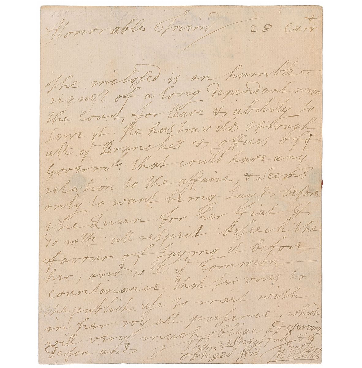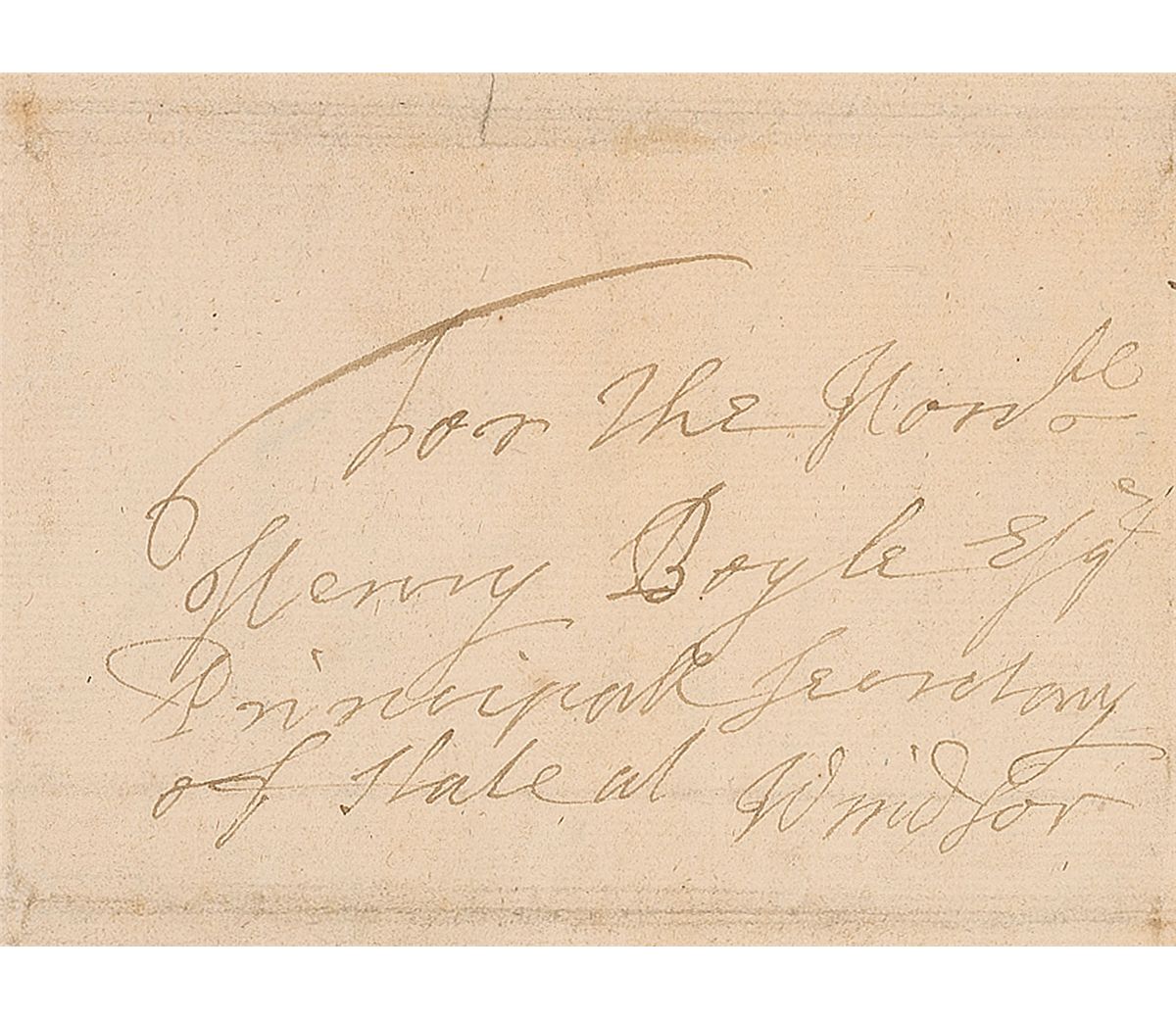 English-born Quaker (1644–1718) and founder of the colony that became the State of Pennsylvania. Extremely rare ALS signed “Wm Penn,” one page, 6 x 7.75, no date but circa 1708–1710. Letter to Henry Boyle, principal secretary of state at Windsor. In part: “The enclosed is an honorble request of a long dependant upon the Court, for leave & ability to serve it. He has travild through all of ye Branche’s & offices of ye Govermte that could have any relation to the affaire, & seems only to want being Layd before the Queen for her fiat. I do with all respect beseech the favour of Laying it before her.” Addressed on the reverse of the second integral page in Penn’s hand. A few small tape-repaired tears, otherwise fine condition. Accompanied by an unsigned engraving of Penn. Henry Boyle served as principal secretary of state for the Northern Department from 1708 to 1710, dating the letter to this period, during which Penn was living in England and suffering from legal and financial troubles—he was placed in debtors’ prison for most of 1708 and his former business partner attempted to foreclose on a loan to him and claim Pennsylvania. Only a handful of Penn ALSs have appeared on the market in the past two decades.