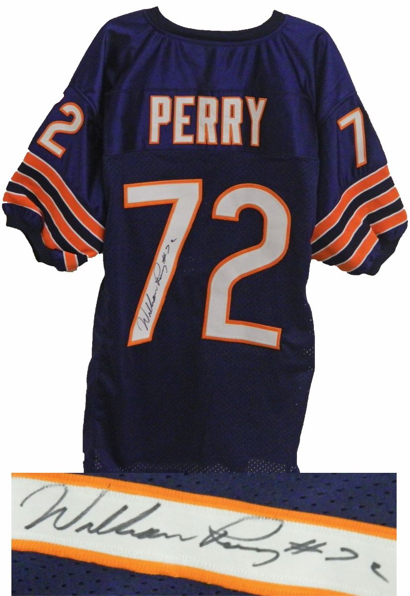 William Perry signed navy custom Throwback jersey. Item comes with a Schwartz Sports Memorabilia tamper-proof numbered hologram and Certificate of Authenticity which can be verified online.