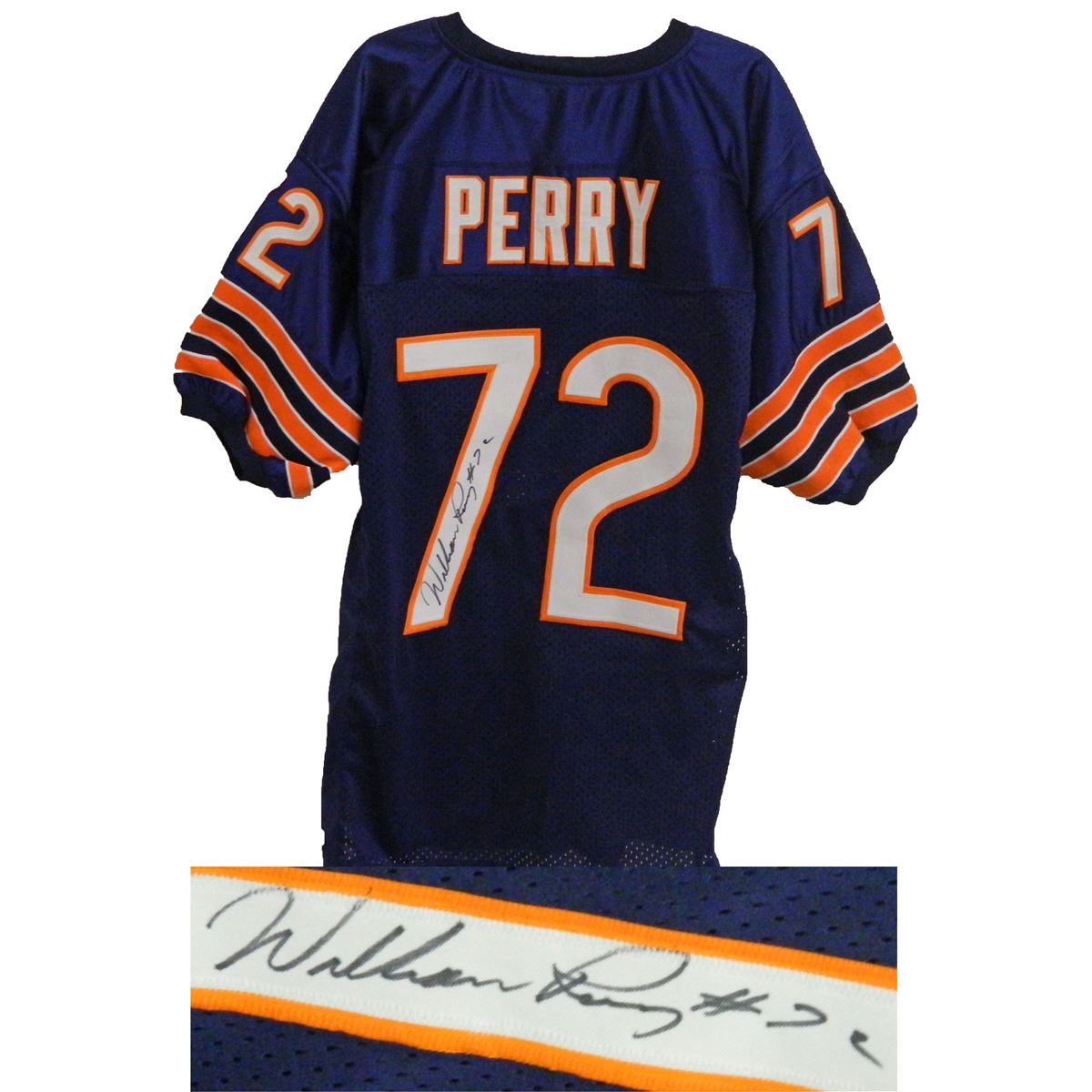 William Perry signed navy custom Throwback jersey. Item comes with a Schwartz Sports Memorabilia tamper-proof numbered hologram and Certificate of Authenticity which can be verified online.