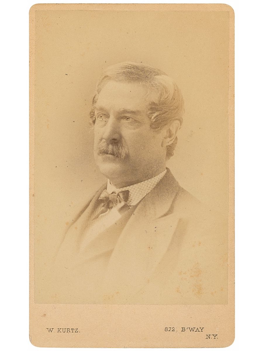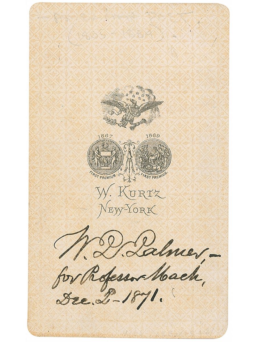 Poet and president of the Manhattan Insurance Company. Original 2.5 x 4 carte-de-visite bust portrait by W. Kurtz of New York, signed and inscribed on the reverse in black ink, “W. P. Palmer—for Professor Mack, Dec. 2d, 1871.” Subtle foxing to the image and a few erased pencil notations to the reverse, otherwise fine condition.