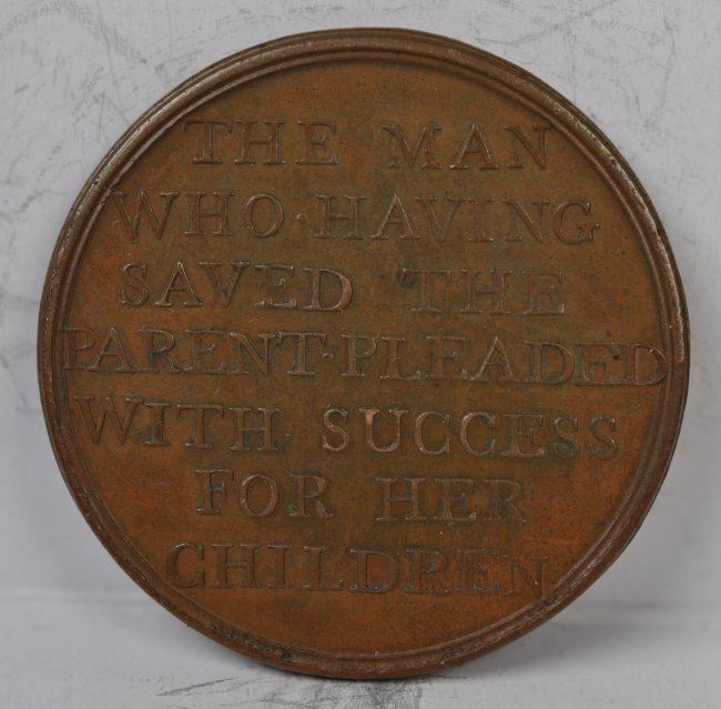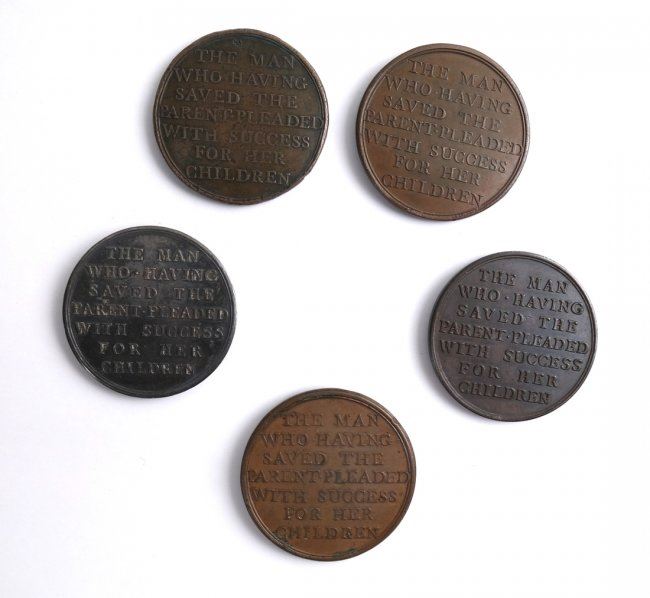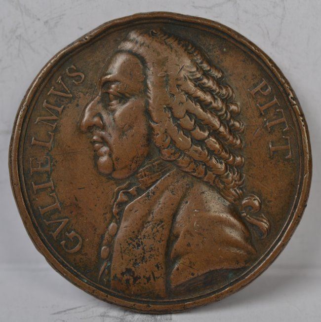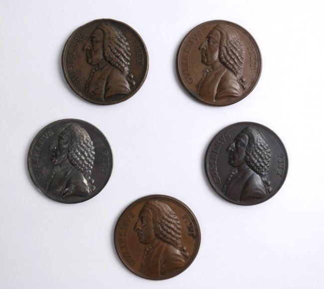 Five pieces of a classic Thomas Pingo engraved William Pitt medal, 40mm. Pitt facing left in high relief, reverse bears a seven line legend. The first, silver proof-like surfaces. Extremely fine condition with a minor spot. The other four, copper or bronze, including some slight variations, three are extremely fine, the last is fine to very fine.