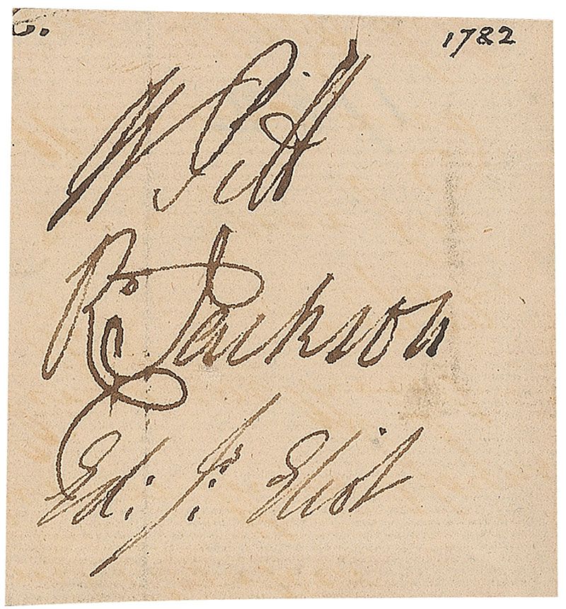 British politician (1759–1806) who served as Prime Minister from 1783 to 1801 and 1804 to 1806. Ink signature, “W. Pitt,” on an off-white 2 x 2.25 slip affixed to a slightly larger sheet. Slip bears two other signatures and an ink notation that dates it to 1782. In fine condition.