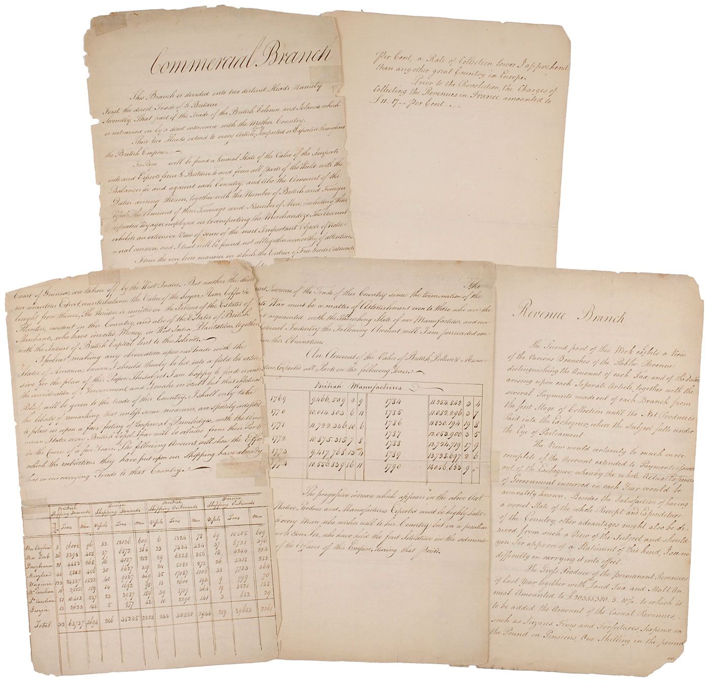 Manuscript document presented to Pitt, eight pages on five sheets, 8 x 13, 1791. Document with small cover sheet labeled, "State of the Navigation, Commerce, and Revenues of the British Empire, with remarks thereon. Presented by Mr. Irving to Mr. Pitt, anno, 1791." A lengthy report discussing the slave trade from Africa and charting trade to each state of the United States, in part: "This branch is divided into two distinct Heads namely first the direct Trade of G. Britain Secondly that of the Trade of the British Colonies and Islands which is not carried by a direct intercourse with the Mother Country…I have taken the liberty Sir to of troubling you with these remarks, upon the Rates or Estimates of this Office, in order to show that the difference between the value of Imports and Exports is very little to be depended upon, in striking the Balance of Trade…In striking the Balance between this Country & the British West Indies, there are several circumstances to be taken into consideration. To the direct Exports from hence, the value of the Goods exported to Africa ought to be added, because the Slaves purchased with those Goods on the Coast of Guinea are taken off by the West Indies…I forebear making any observation upon our Trade with the States of America…The following account will show the Effect which the restrictions they have put upon our shipping have already had on our carrying Trade to that Country." Repaired partial separations to folds, fragile overall toning, and substantial chipping to edges, otherwise very good condition.