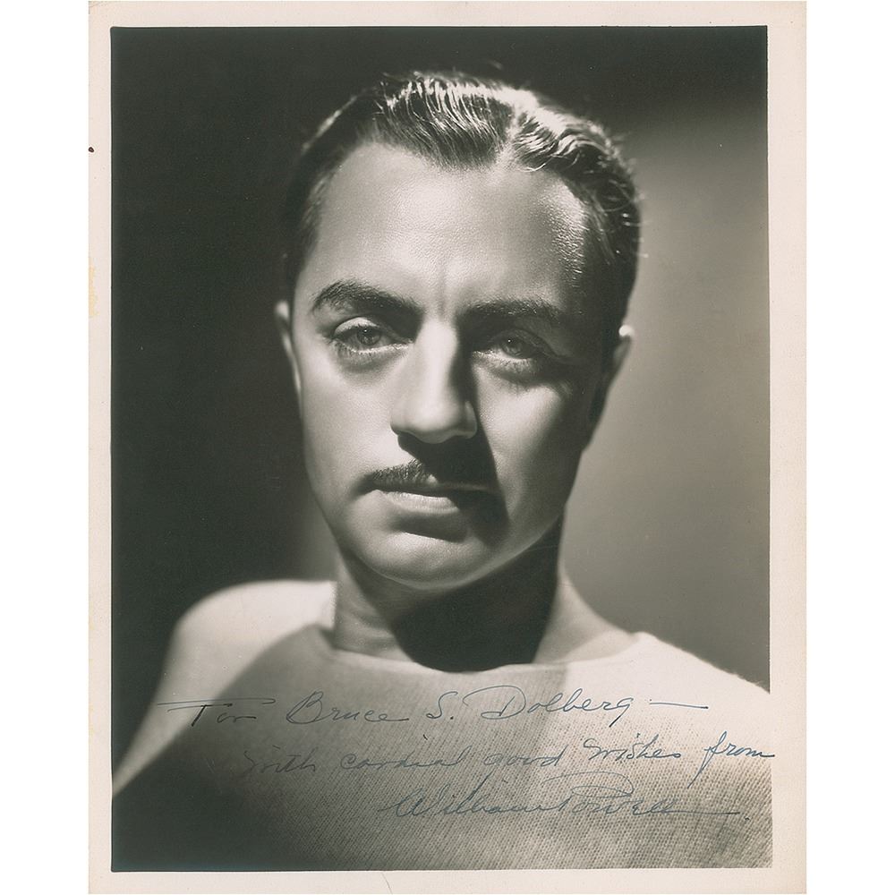 Striking vintage matte-finish 8 x 10 photo of Powell bathed in low-key lighting, signed and inscribed in fountain pen, "For Bruce S. Dolberg—With cordial good wishes from William Powell.” In very fine condition.