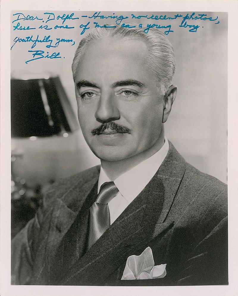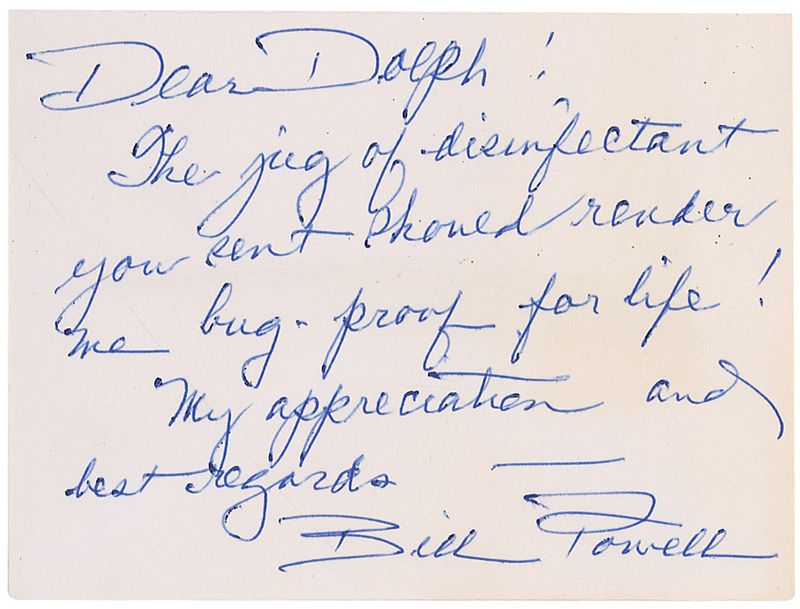 Two items: one matte-finish 8 x 10 photo, signed and inscribed in blue ink, “Dear Dolph—Having no recent photos, here is one of me as a young boy. Youthfully yours, Bill”; and one ANS inside a 4 x 3 thank-you card which reads, in part, “The jug of disinfectant you sent should render me bug-proof for life!” A few creases and rippling to the top edge of the photo, otherwise fine condition.