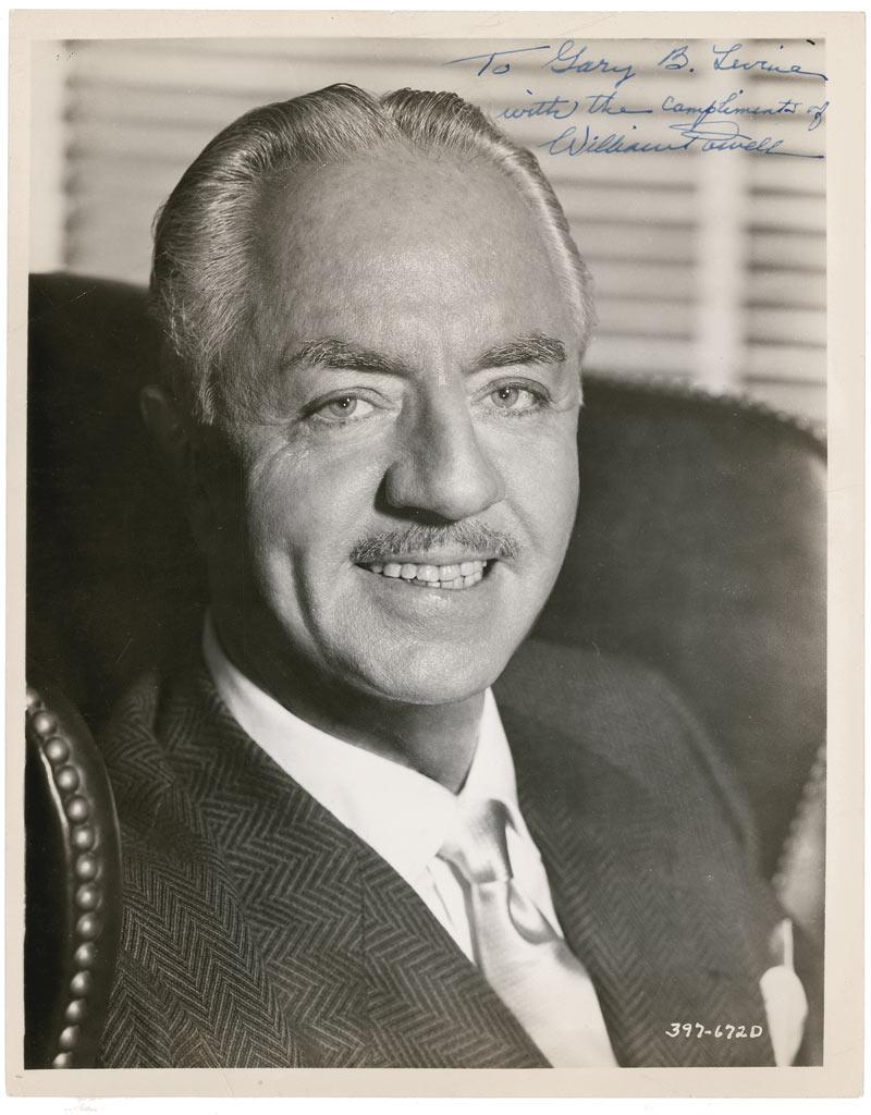 Vintage glossy 8 x 10 close-up photo of Powell in a parlor chair, signed and inscribed in blue ink “To Gary B. Levine, with the compliments of William Powell.” In very good condition, with noticeable diagonal crease to top left, and scattered light creases, surface marks, and impressions. Pre-certified PSA/DNA and RRAuction COA.