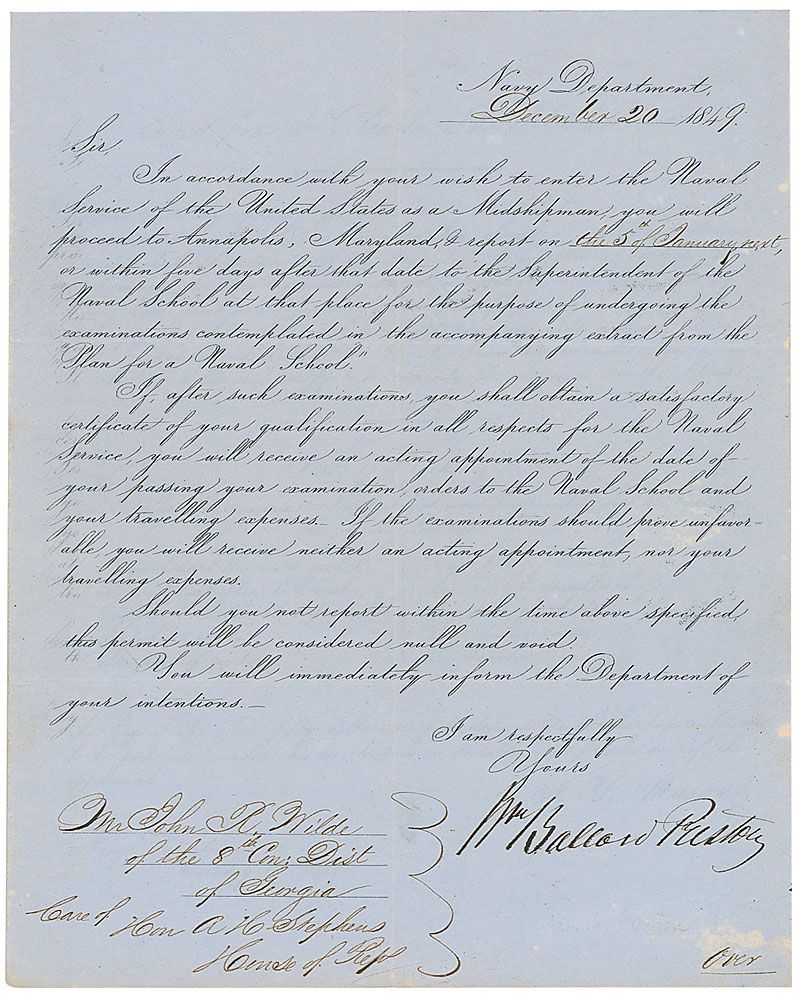 Virginia politician who served as secretary of the Navy under Zachary Taylor (1805–1862). Partly-printed LS signed “Wm. Ballard Preston,” one page, 7.75 x 9.75, Navy Department letterhead, December 20, 1849. Letter ordering John R. Wilde of Georgia to “proceed to Annapolis…for the purpose of undergoing the examinations contemplated in the accompanying extract from the ‘Plan for a Naval School.’” Second adjoining page bears a printed excerpt regarding admissions requirements. In fine condition, with intersecting mailing folds and scattered spots of toning.