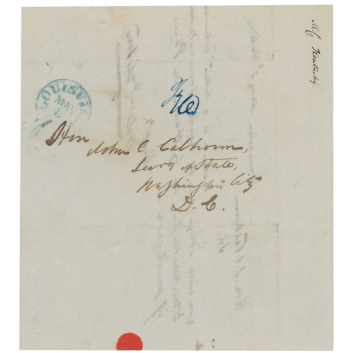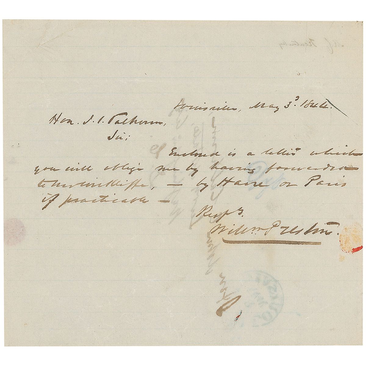 Lawyer, politician, and Confederate brigadier general (1816–1887). ALS signed “Willm. Preston,” one page, 7.75 x 7, May 3, 1844. Letter to Secretary of State John C. Calhoun. In part: “Enclosed is a letter which you will oblige me by having forwarded.” Addressed on the reverse in Preston’s hand. Professionally inlaid into a larger off-white sheet. In fine condition.