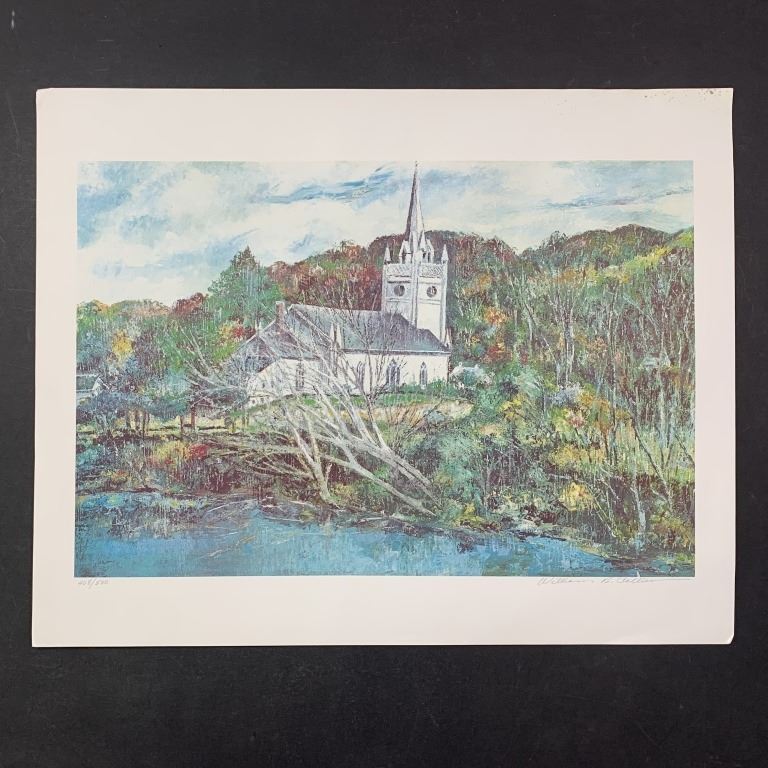 William R. Collier's "The Church" Limited Edition Print. Overgrowth and shrubbery has surrounded an old church built beside the water's edge. This piece is signed on the lower right and numbered 408/500 in the lower left. There is a little staining in the upper right corner and a small dog-ear in the upper left corner but neither affects the image. This piece is in good condition