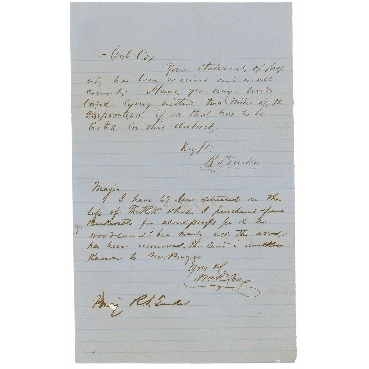Confederate general (1832–1919), who suffered at least eleven combat wounds and was a three-term member of the House of Representatives and Secretary of the United States Senate from 1893–1900. Unique and interesting war-date ALS signed “Wm. R. Cox,” one page, lightly-lined, 5.5 x 9, no date [but written between 1862–June 2, 1864]. After receiving word from Major R. S. Tucker that his property statements have been received, Cox writes below Tucker’s letter, in full: “I have 69 acres situated on the left of The R. R. which I purchased from…for about $10 or $11 per acre as woodlands but mostly all the wood has been removed. The land is doubtless known to Mr. Briggs.” In very good condition, with creasing, toning, a few tears affecting the text of the letter, and a bit of mirroring from where the letter was folded.