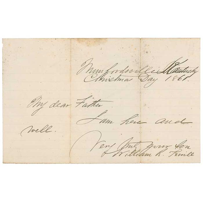 Union general who was killed in action at the Battle of Perryville during the Civil War. His brother was also killed during the same war, making the Terrills one of the few sets of American brothers killed in action while commanding brigades. Ironically, they were on opposite sides in the conflict. War-dated ALS, one page, lightly-lined, 7.75 x 5, Christmas Day, 1861. Brief letter to his father, prominent Bath County attorney William H. Terrill. In full, “I am here and well.” Two vertical folds, one through a single letter of signature, and scattered toning and soiling, otherwise fine condition.