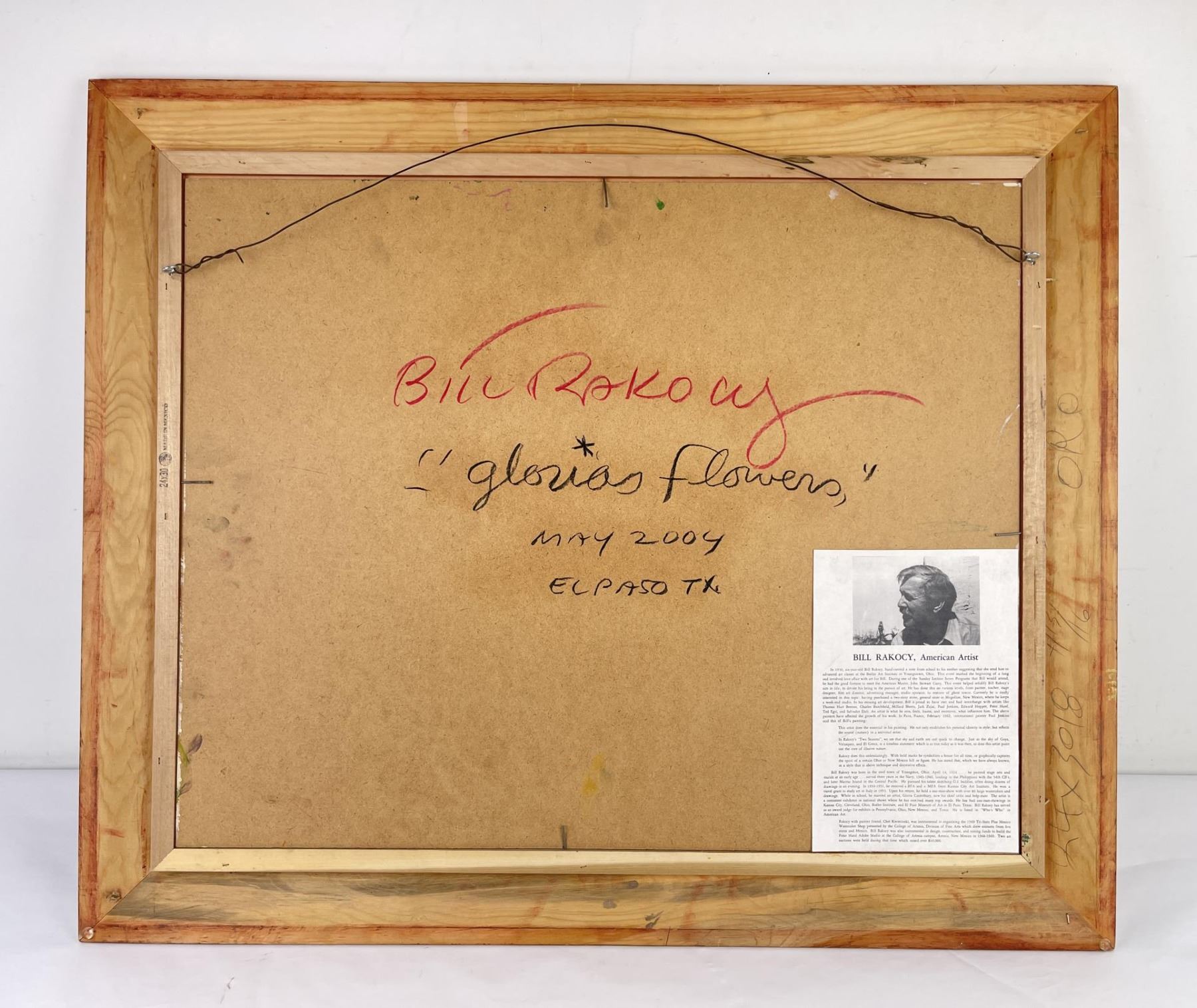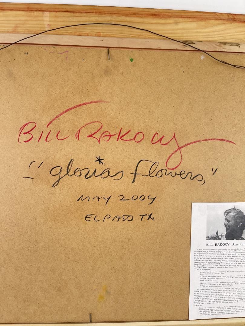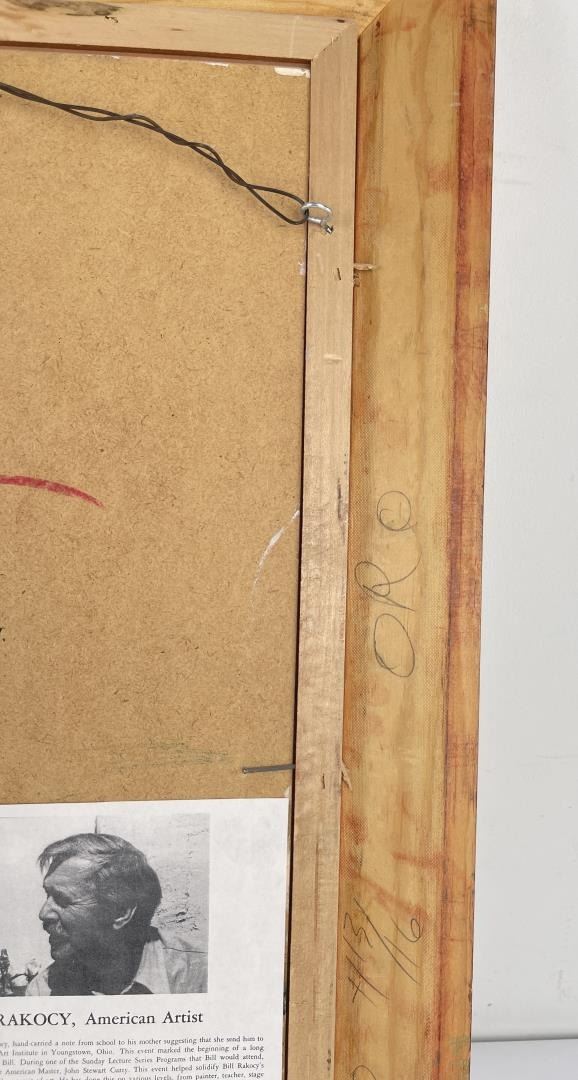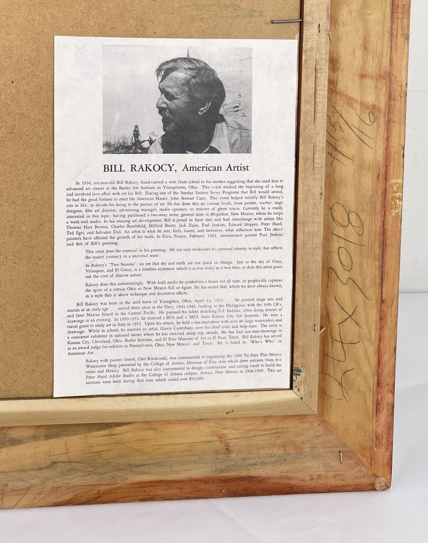 30.75" by 36.75" framed. William Joseph (Bill) Rakocy (1924 - 2015) was active/lived in Texas, Ohio. William Rakocy is known for Landscape, figure and historical genre painting. William Joseph Rakocy received his Bachelor and Master of Fine Arts degrees at the Kansas City Art Institute. A resident of El Paso for over 30 years, Rakocy is an artist, author, and historian. His favorite subjects are the land, people, and history of El Paso and the surrounding countryside. Curator of Education at the El Paso Museum of Art and an award-winning artist, Rakocy is also the author of books on art, regional history and ghost towns.