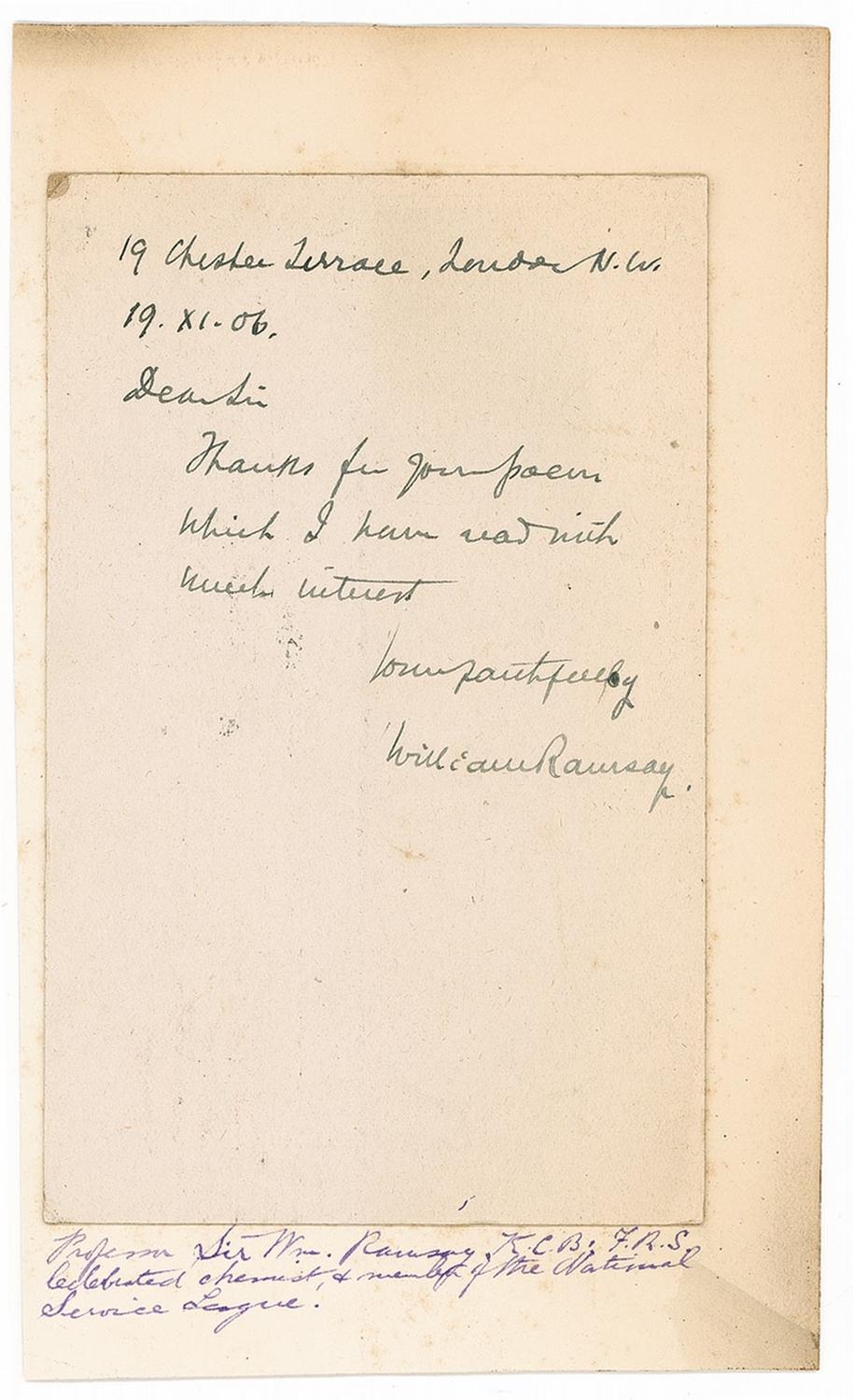 British chemist (1852–1916) who discovered the noble gases and won the 1904 Nobel Prize in Chemistry. ALS, on a 3.5 x 5.5 postcard, November 19, 1906. Brief letter to an unidentified gentleman. In full: “Thanks for your poem which I read with much interest.” Letter is affixed to a 4.25 x 7 off-white card, with several collector notations along bottom. In fine condition, with some scattered light toning and soiling, as well as light postal impressions. Ramsay is uncommon in any form.