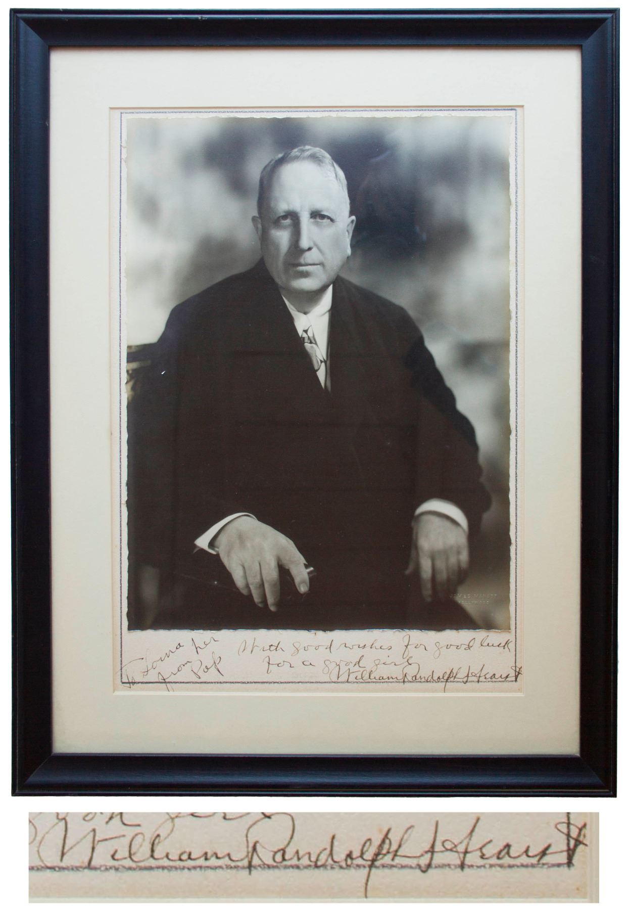 Impressive photo of William Randolph Hearst, signed upon the mat to Lorna Velie, his daughter-in-law married to his son George Randolph Hearst. The large, stately photo measures 10.25'' x 13.25'', affixed to a presentation mat measuring 11'' x 15'', upon which Hearst writes, ''To Lorna from her Pop / With good wishes for good luck for a good girl / William Randolph Hearst''. With photographer's stamp at lower right, ''James Manatt / Hollywood''. Not examined out of frame, which measures 16'' x 20.25''. Mild silvering to photo, overall near fine condition.