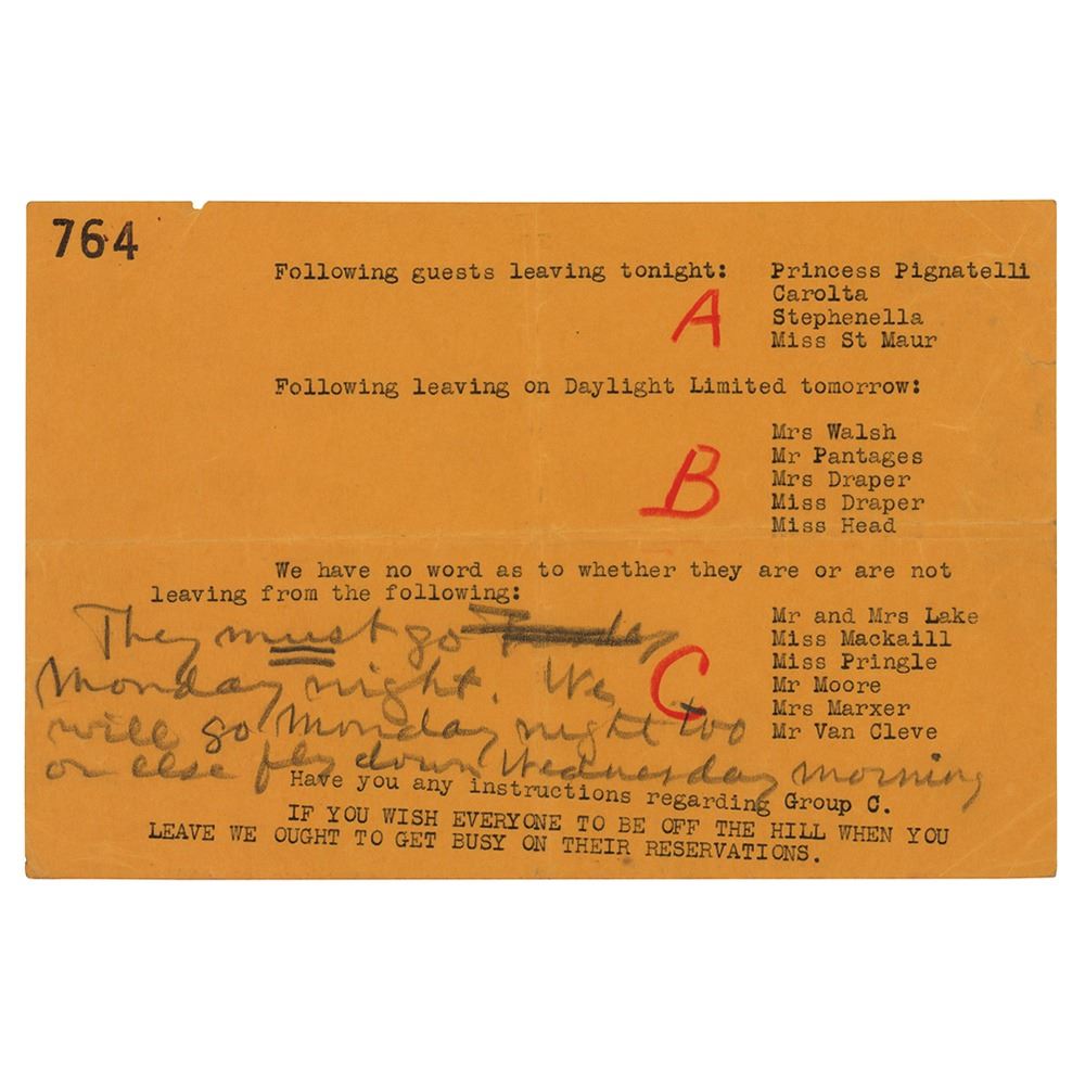The notes on the 764 sheet, which features a set of three typed guest departure lists, reads: They must go Monday night. We will go Monday night too or else fly down Wednesday morning. Among the names listed include: his alleged daughter Patricia Lake, her husband Arthur Lake, and gossip columnist Princess Conchita Pignatelli.