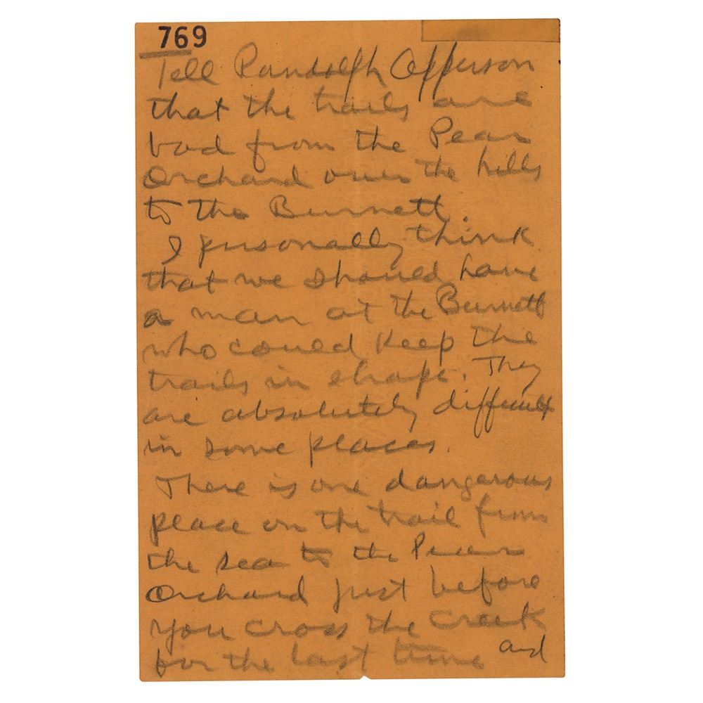 The third sheet, numbered 769, reads: Tell Randolph Apperson that the trails are bad from the Pear Orchard over the hills to the Burnett. I personally think that we should have a man at the Burnett who could keep the trails in shape. They are absolutely difficult in some places. There is one dangerous place on the trail from the sea to the Pear Orchard just before you cross the creek for the last time and