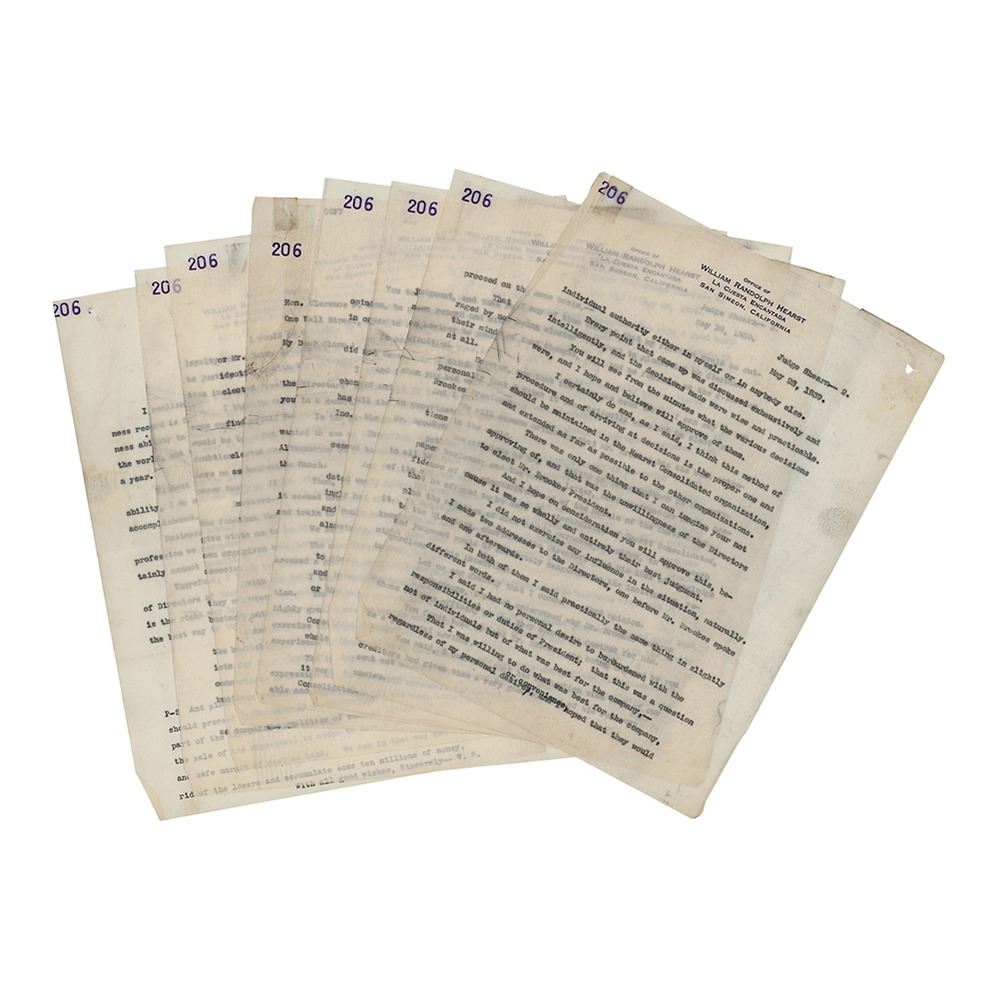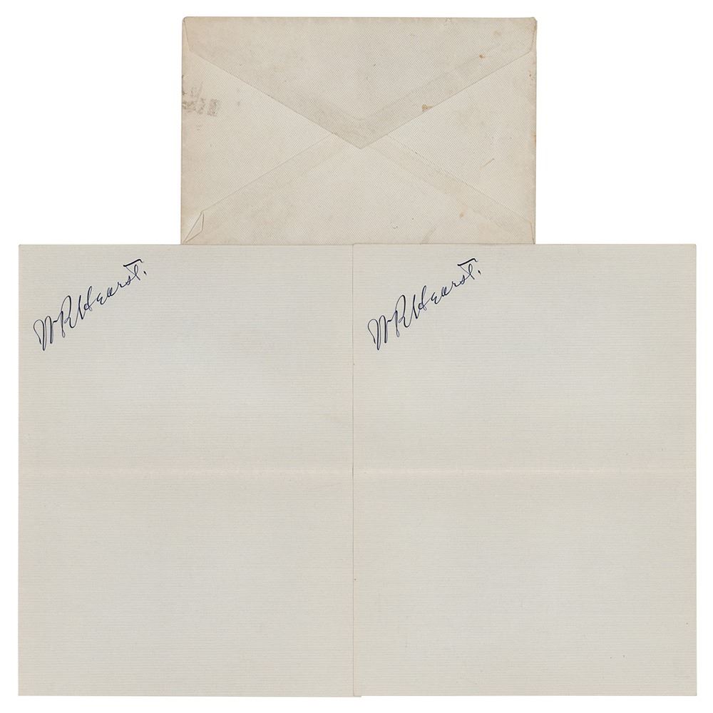 The lengthy carbon copy letter to Shearn, eight pages, 8.5 x 11, dated May 28, 1939, concerns a recent board meeting and also rejects Shearn's proposed candidate for the president of Hearst's Consolidated, a businessman named John St. Clair Brookes, Jr. In part: The impression I had from the meeting was that the free expression and authoritative action of such a collection of able and experienced men was much better than concentrated individual authority either in myself or in anybody elseI realized that I am primarily an editor, and that my business record is far from perfect; but at least I had enough business ability to build up the greatest publishing institution in the world, and to make it pay a profit of twelve million dollars a year. Includes two off-white 6.5 x 8.5 sheets of personal stationery, marked W. R. Hearst in the upper left corner. In overall very good to fine condition, with some creasing and tears.