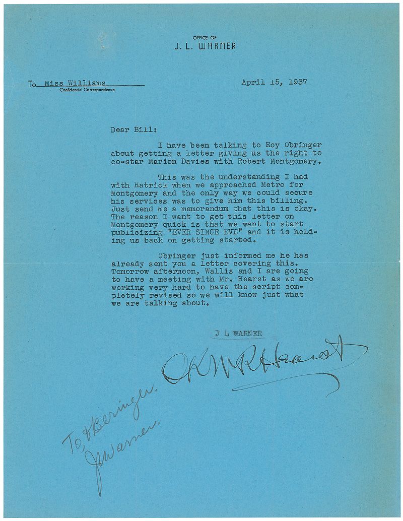 Endorsement signed “OK, W. R. Hearst,” one page, 8.5 x 11, April 15, 1937. Typed letter from film executive Jack Warner regarding casting in Ever Since Eve and endorsed by Hearst at the conclusion. In part: “I have been talking to Roy Obringer about getting a letter giving us the right to co-star Marion Davies with Robert Montgomery… Just send me a memorandum that this is okay… Wallis and I are going to have a meeting with Mr. Hearst as we are working very hard to have the script completely revised so we will know just what we are talking about.” Hearst has approved the request with his signature at the bottom of the page. In very good condition, with intersecting folds, light scattered creases, toning working in from two edges, a tear to the left edge, and a small hole to the upper left.