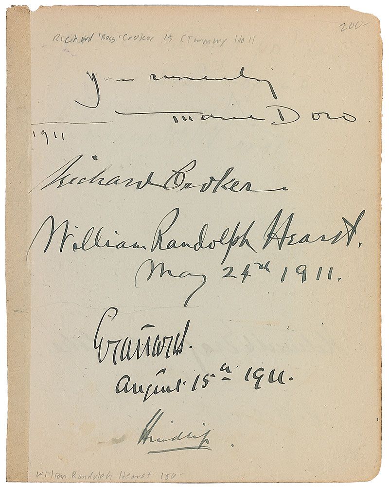 Ink signature, “William Randolph Hearst, May 24th, 1911,” on an off-white 5 x 6.25 album page, signed by seven others on both sides, with collector’s pencil notations to top and bottom. In fine condition, with some scattered light toning and soiling, with a thin strip of toning along left edge.