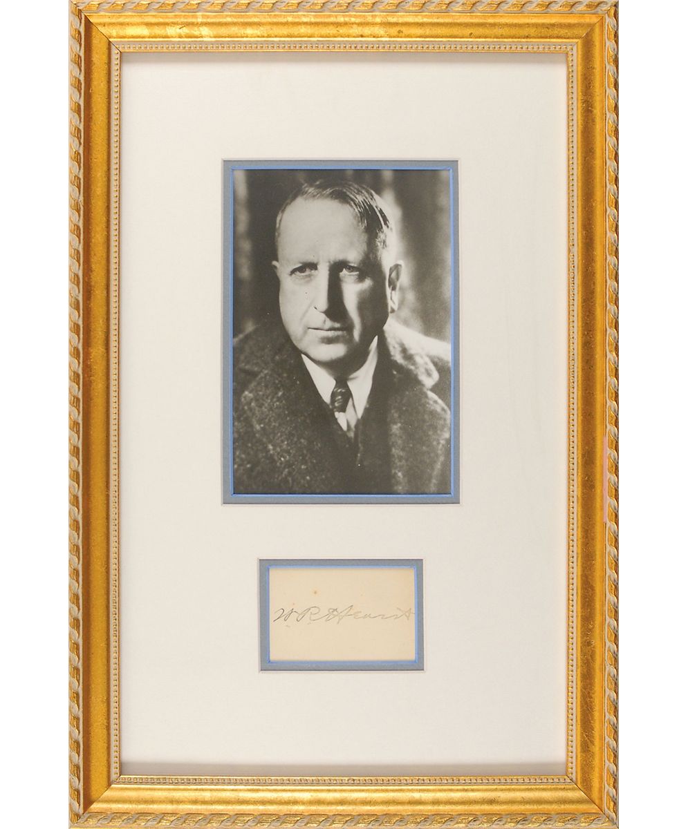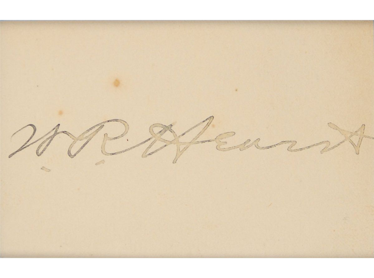 Fountain pen signature, “W. R. Hearst,” on an off-white 3 x 2 card. Nicely double-matted and framed with a bust portrait of the publisher to an overall size of 11 x 17. A couple spots of foxing and slight fading to signature, otherwise fine condition.