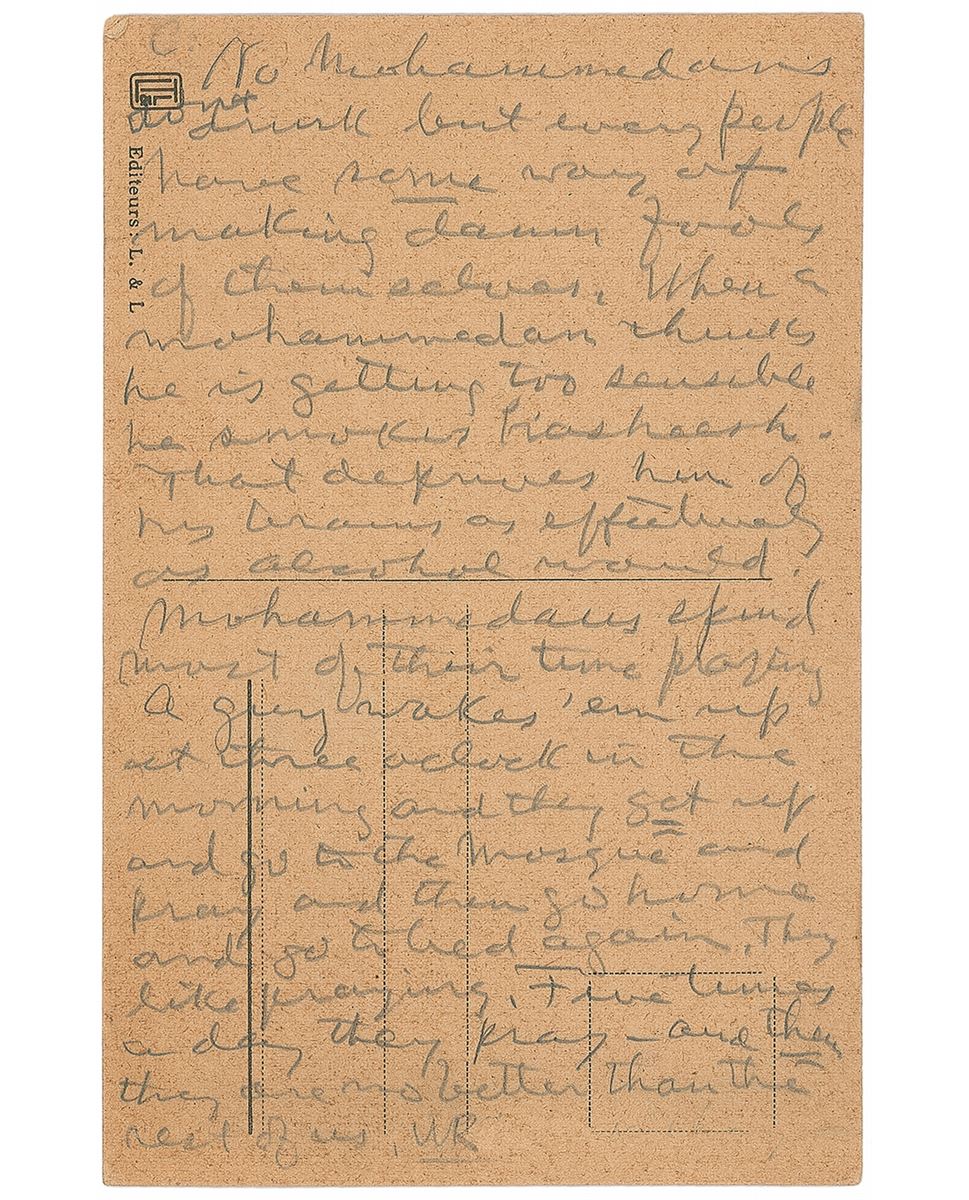 ALS in pencil, signed “WR,” one page on the reverse of a 3.5 x 5.5 postcard depicting two women from Tangiers smoking a hookah, no date. Unusual letter describing his foreign travels. In full: “No Mohammedans do not drink but every people have some way of making damn fools of themselves. When a Mohammedan thinks he is getting too sensible he smokes hasheesh. That deprives him of his brains as effectively as alcohol would. Mohammedans spend most of their time praying. A guy wakes ’em up at three o’clock in the morning and they get up and go to the mosque and pray and then go home to bed again. They like praying. Five times a day they pray—and then they are no better than the rest of us.” In fine condition. Hearst was a strict teetotaler and held conservative social values, despite his own affair with actress Marion Davies.