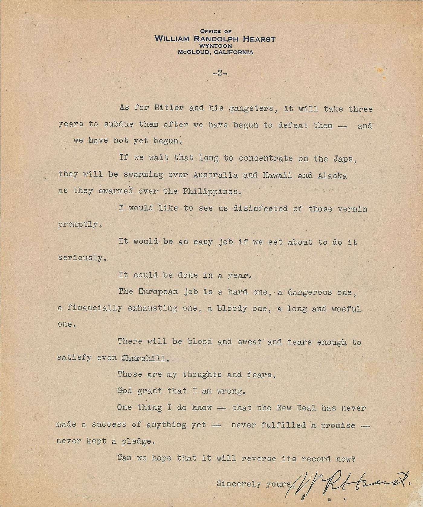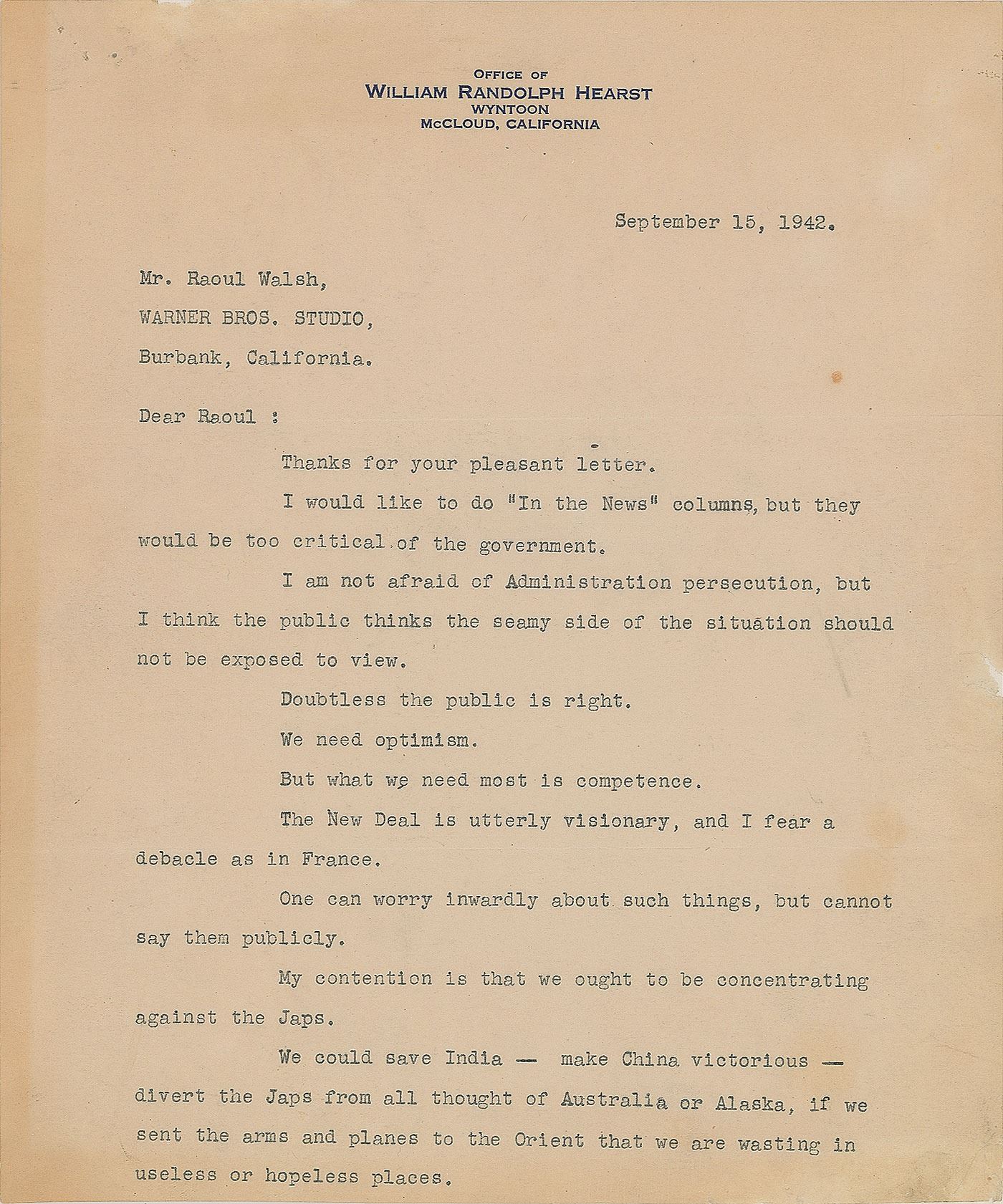 Interesting TLS signed “W. R. Hearst,” two pages, 8.5 x 10, personal letterhead, September 15, 1942. Letter to Warner Bros. director Raoul Walsh, in part: "I would like to do 'In the News' columns, but they would be too critical of the government. I am not afraid of Administration persecution, but I think the public thinks the seamy side of the situation should not be exposed to view. Doubtless the public is right. We need optimism. But what we need most is competence. The New Deal is utterly visionary, and I dear a debacle as in France. One can worry inwardly about such things, but cannot say them publicly. My contention is that we ought to be concentrating on the Japs. We could save India—make China victorious—divert the Japs from all thought of Australia or Alaska, if we sent the arms and planes to the Orient that we are wasting in useless or hopeless places. As for Hitler and his gangsters, it will take three years to subdue them after we have begun to defeat them—and we have not yet begun. If we wait too that long to concentrate on the Japs, they will be swarming all over Australia and Hawaii and Alaska as they swarmed over the Philippines. I would like to see us disinfected of those vermin promptly. It would be an easy job if we set about to do it seriously. It could be done in a year. The European job is a hard one, a dangerous one, a financially exhausting one, a bloody one, a long and woeful one. There will be blood and sweat and tears enough to satisfy even Churchill. Those are my thoughts and fears. God grant that I am wrong. One thing I do know—that the New Deal has never made a success of anything yet—never fulfilled a promise—never kept a pledge. Can we hope that it will reverse its record now?" Each page is removably encapsulated in a mylar sleeve. In fine condition, with light edge toning.