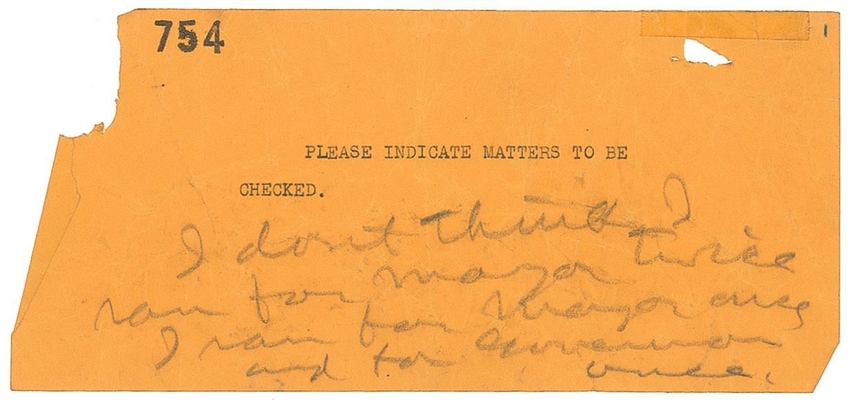 The notes on the “754” sheet, with typed caption, “Please indicate matters to be checked,” read as follows: “I don’t think I ran for mayor twice. I ran for mayor once and for governor once.” Hearst did indeed run for Mayor of New York City twice; in 1905 and 1909. He ran for Governor of New York in 1906.