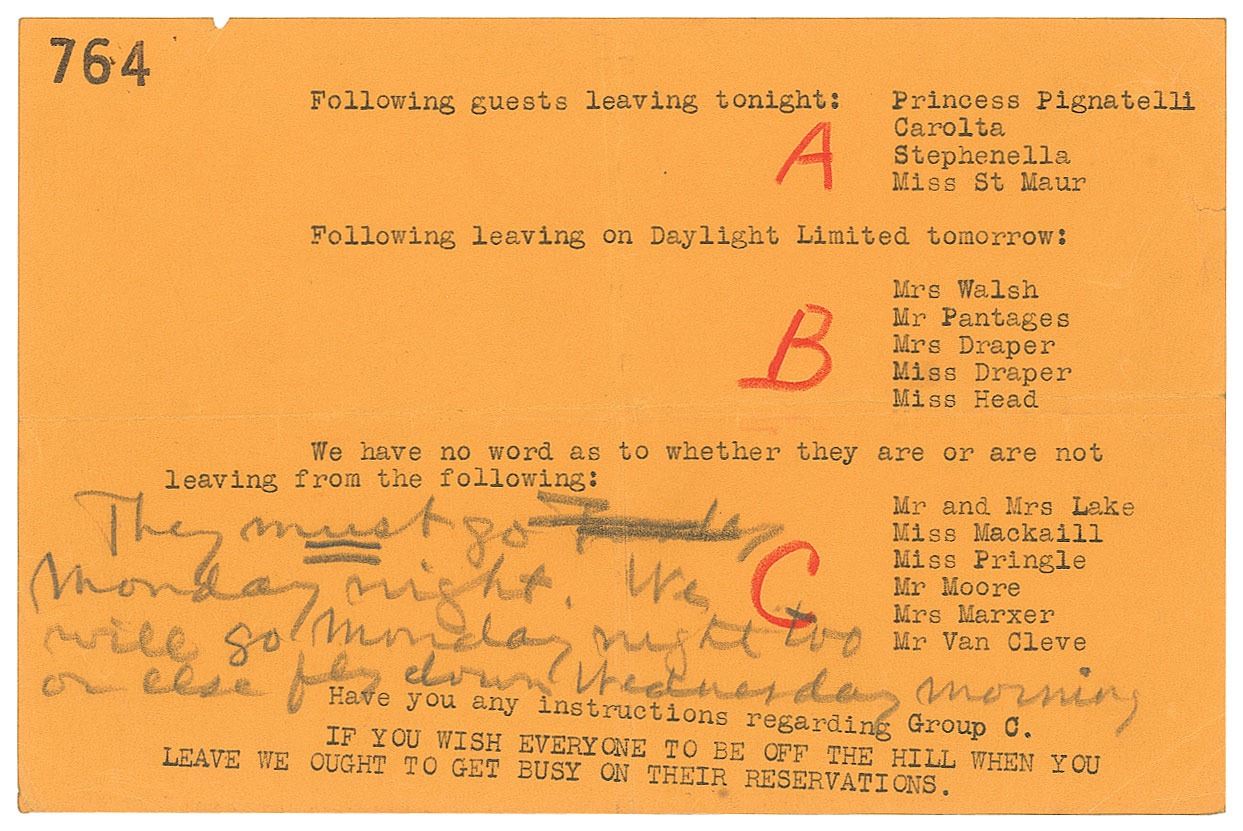 The notes on the “764” sheet, which features a set of three typed guest departure lists, reads: “They must go Monday night. We will go Monday night too or else fly down Wednesday morning.” Among the names listed include: his alleged daughter Patricia Lake, her husband Arthur Lake, and gossip columnist Princess Conchita Pignatelli.