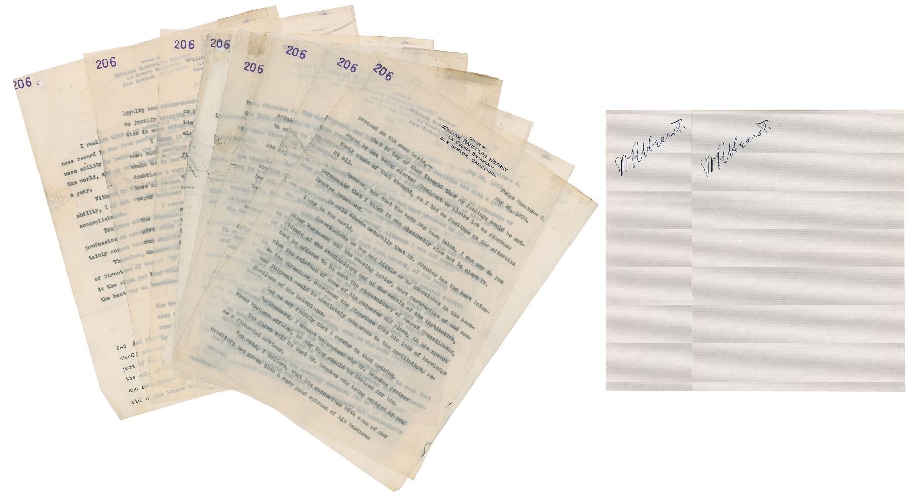 The lengthy carbon copy letter to Shearn, eight pages, 8.5 x 11, dated May 28, 1939, concerns a recent board meeting and also rejects Shearn’s proposed candidate for the president of Hearst’s Consolidated, a businessman named John St. Clair Brookes, Jr. In part: “The impression I had from the meeting was that the free expression and authoritative action of such a collection of able and experienced men was much better than concentrated individual authority either in myself or in anybody else…I realized that I am primarily an editor, and that my business record is far from perfect; but at least I had enough business ability to build up the greatest publishing institution in the world, and to make it pay a profit of twelve million dollars a year.” Includes two off-white 6.5 x 8.5 sheets of personal stationery, marked “W. R. Hearst” in the upper left corner. In overall very good to fine condition, with some creasing and tears.