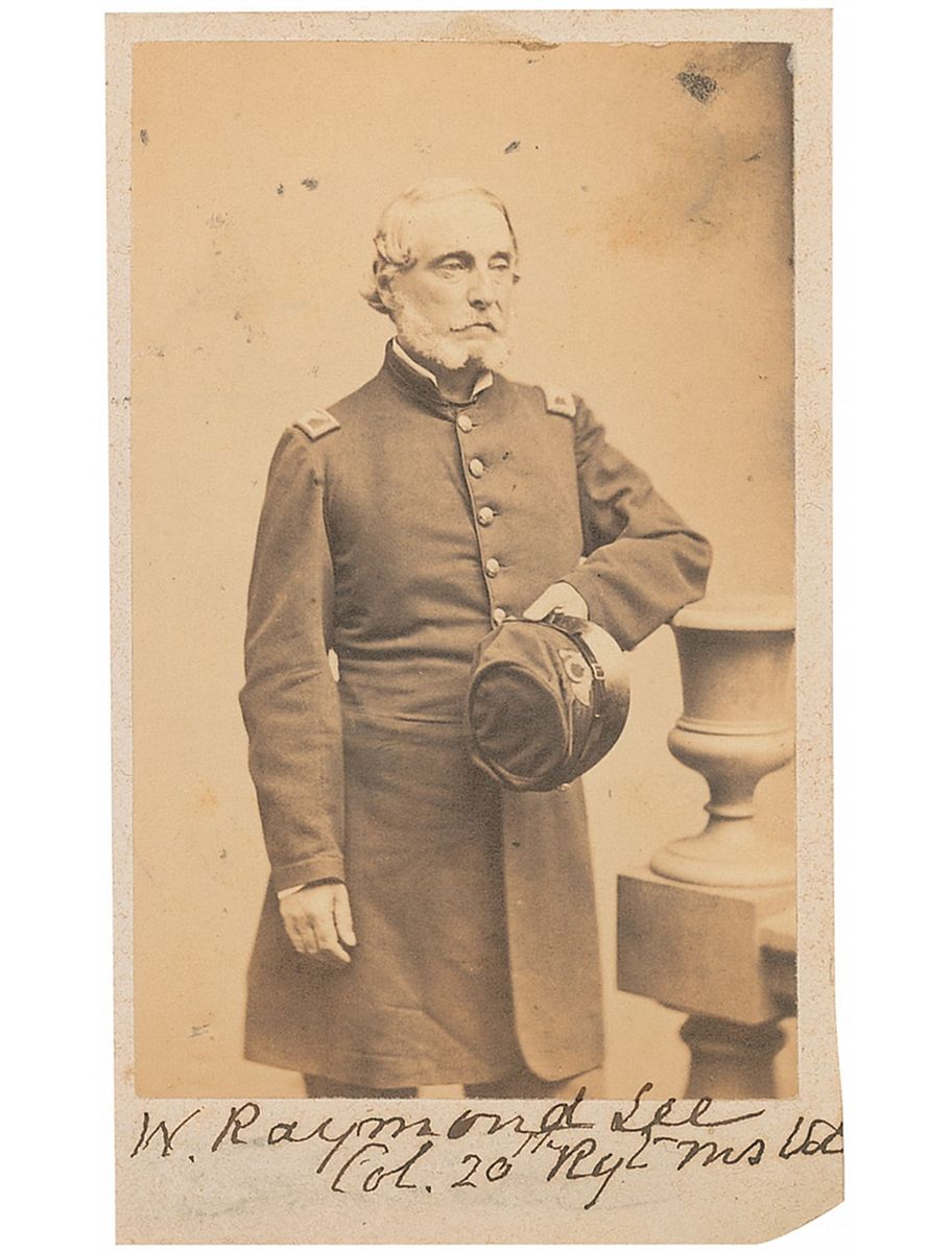 Brigadier general who was captured at Ball’s Bluff; he became disabled when a horse fell on him at Nelson’s farm. Original 2.25 x 4 three-quarter length carte-de-visite photo of Lee in uniform by J. E Tilton of Boston, signed in the lower border in black ink, “W. Raymond Lee, Col. 20th Regt Ms Vols.” Some light soiling to background, and a missing lower right corner tip, otherwise fine condition.