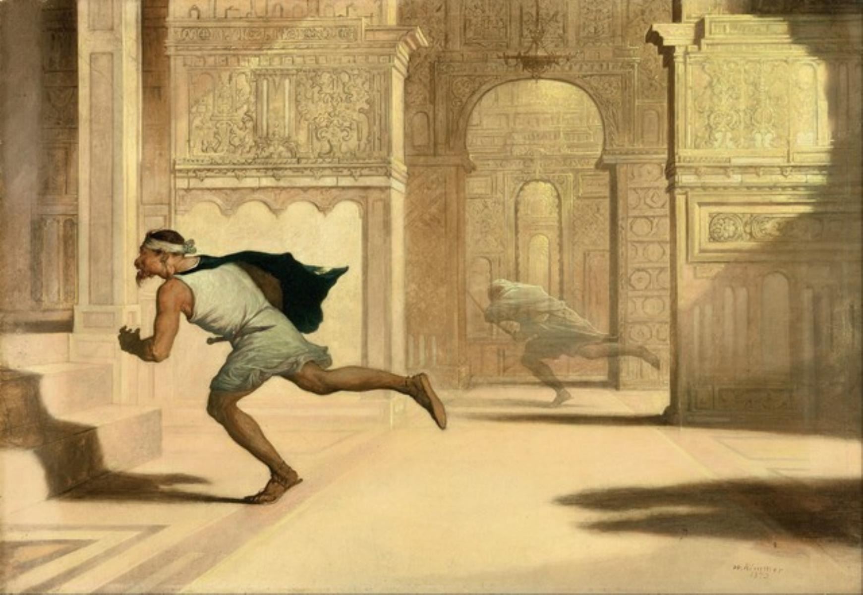 Artist: William Rimmer - Title: Flight and Pursuit>Medium: Fine Art Giclee on Canvas - Image Size: Approximately 22 inches x 32 inches - Framed: Unframed on Unstretched Canvas - Biography: Rimmer's most famous work, though not normally associated with him, is Evening: Fall of Day, which was the basis for the Swan Song Records logo that the English rock group Led Zeppelin used. Another celebrated painting is his Flight and Pursuit in the Boston Museum of Fine Arts